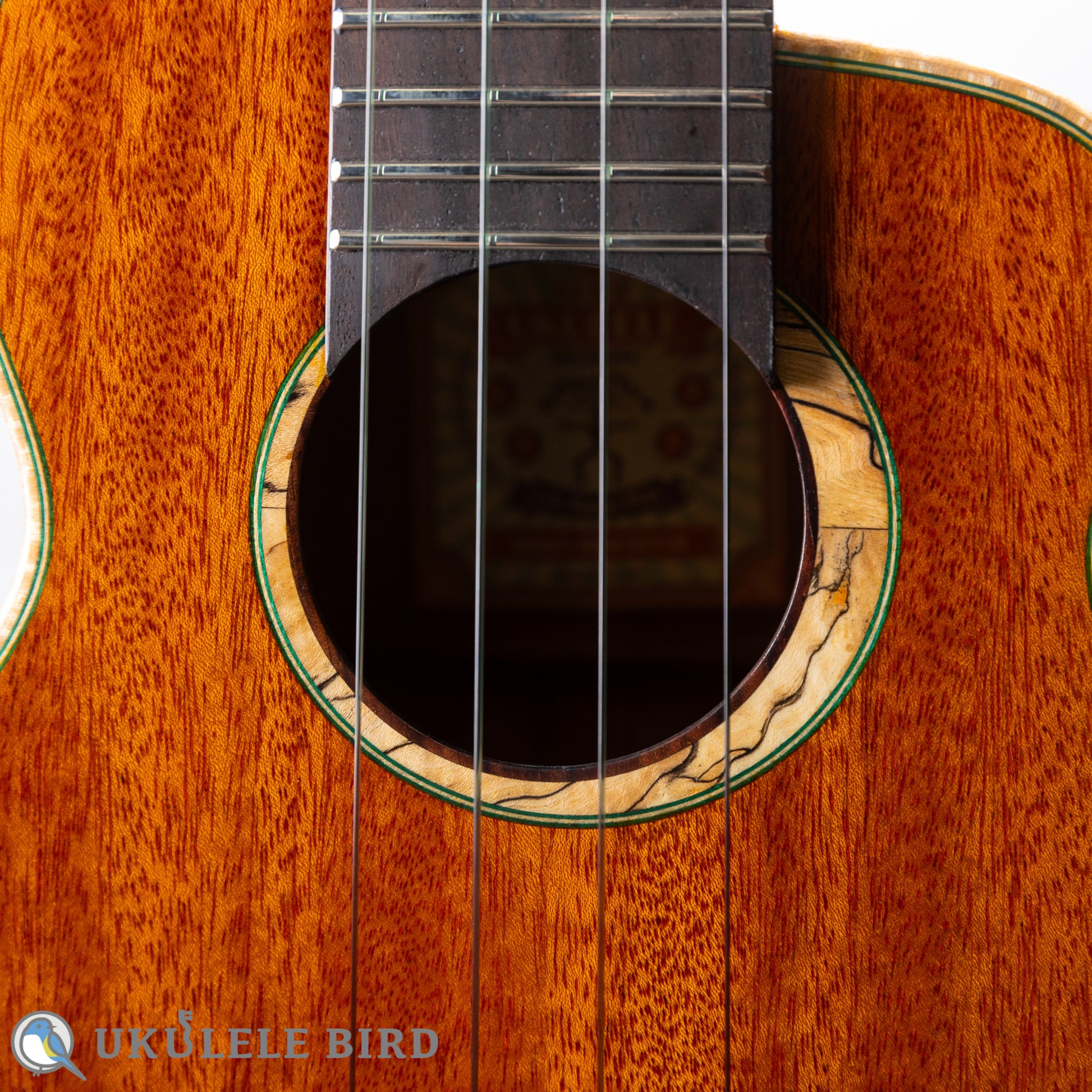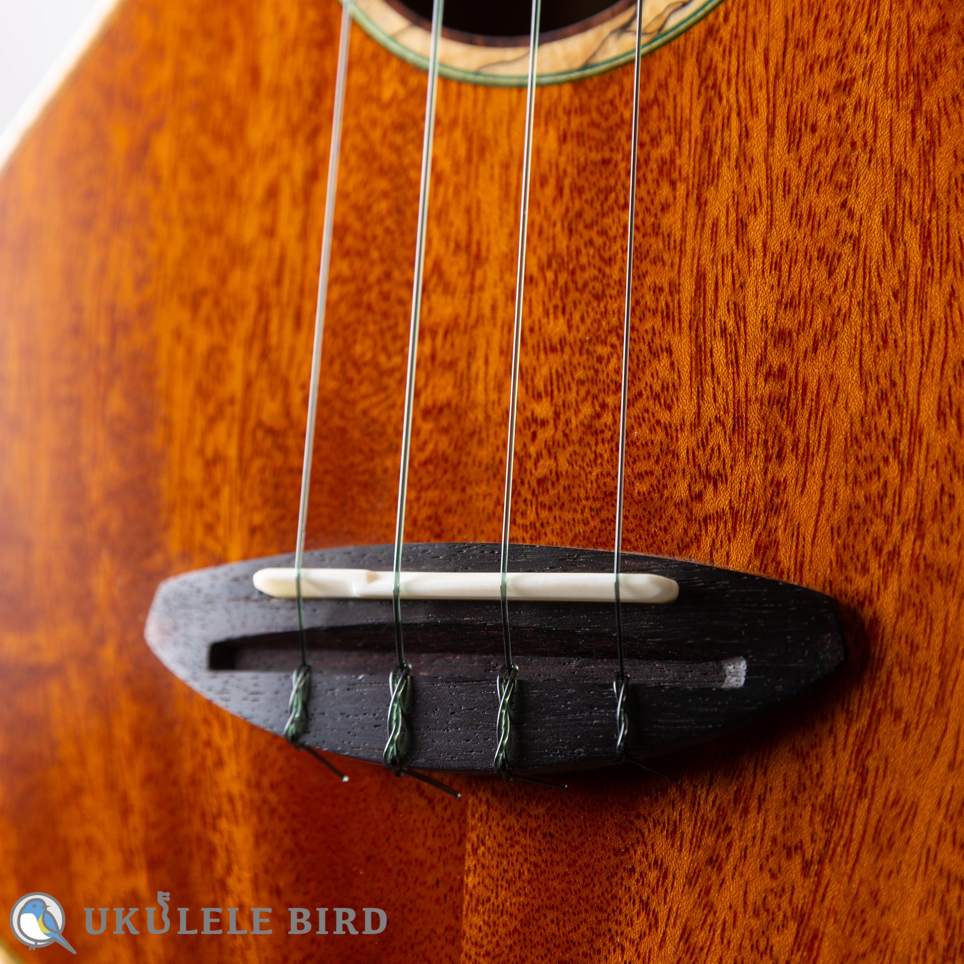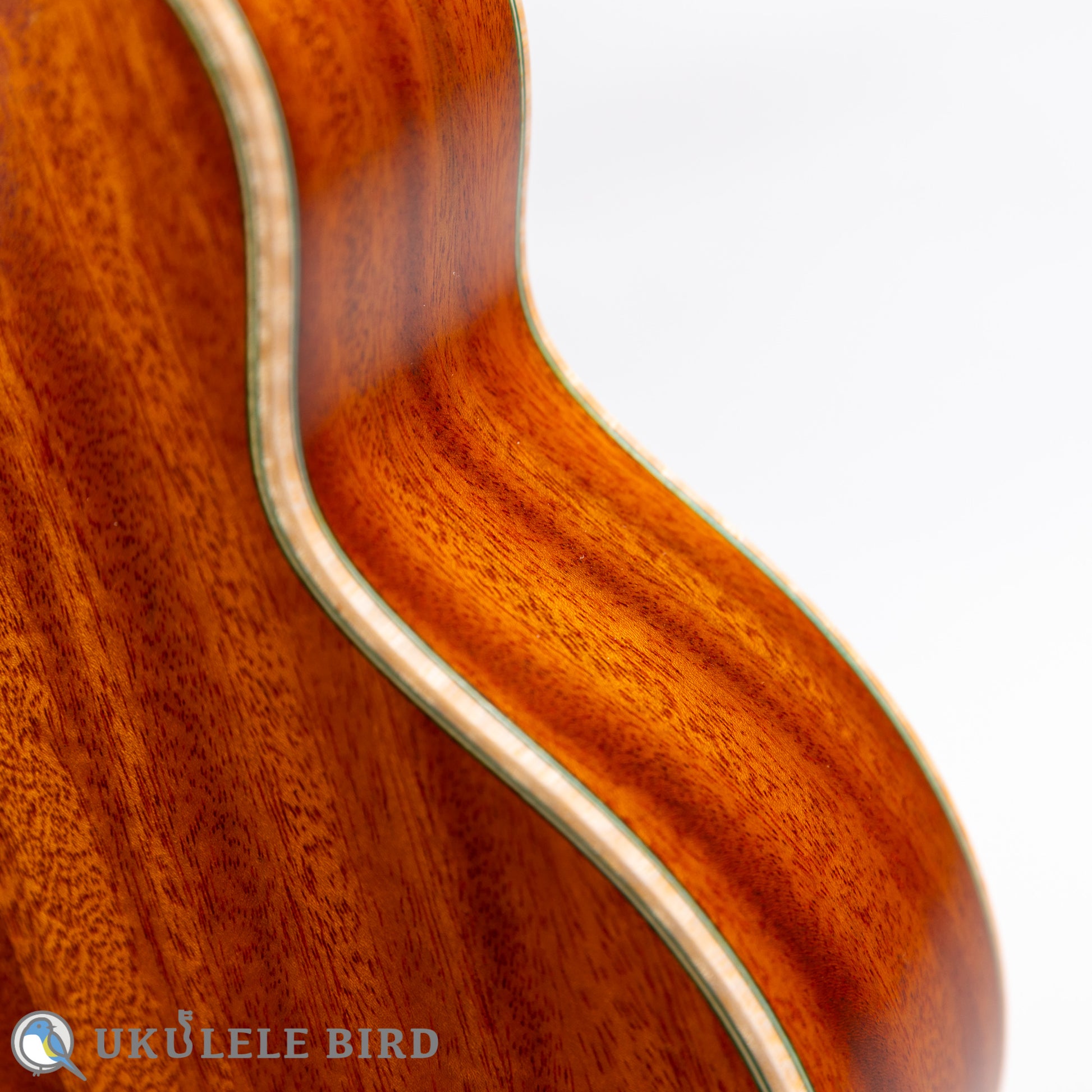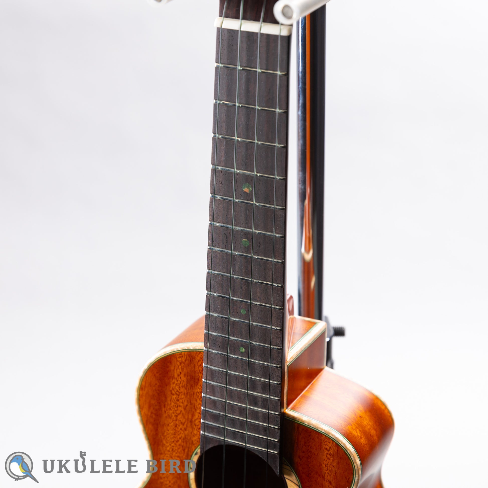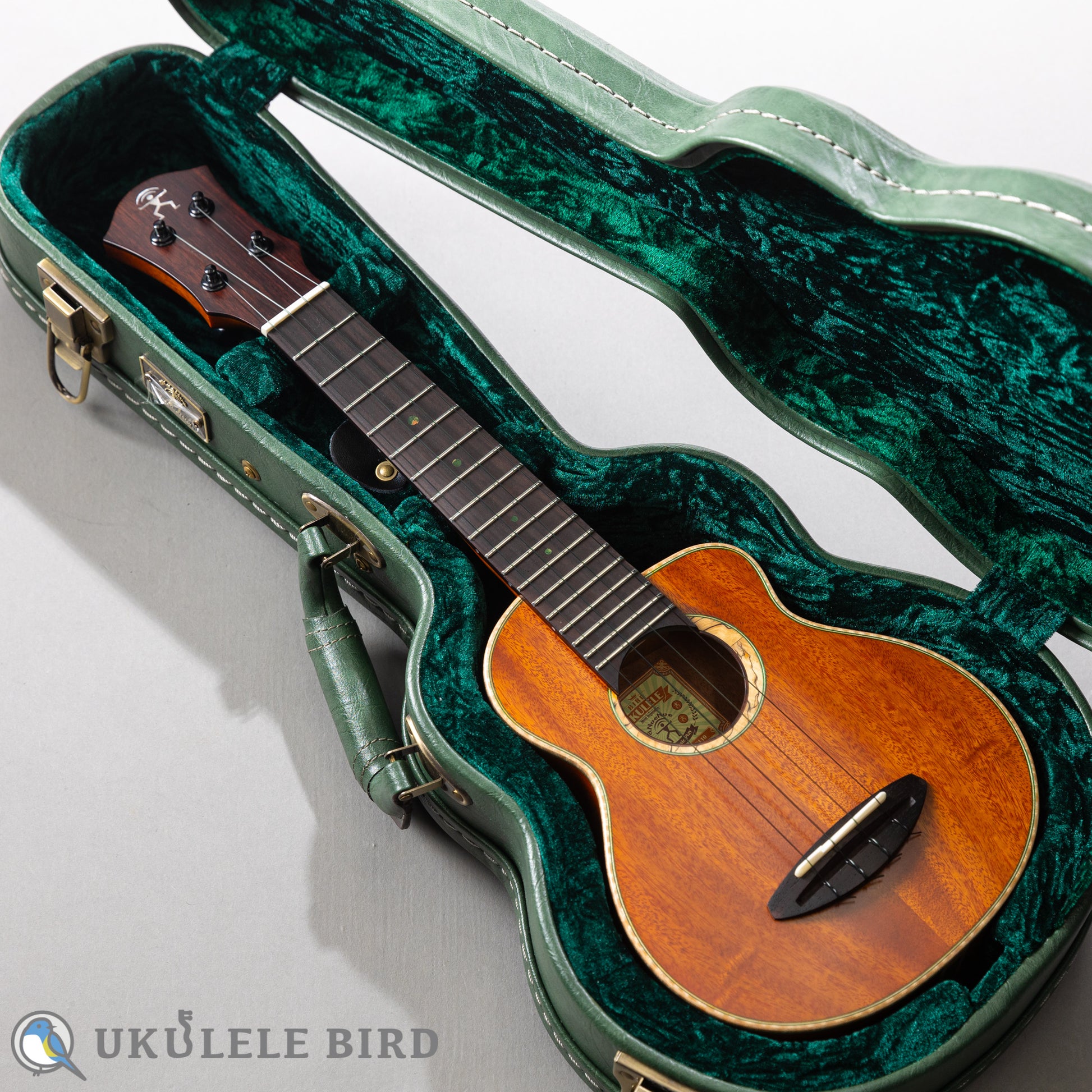 グリーンバードシリーズと名付けられ、ロゼッタやバインディング、ポジションマーク、ボディエンド等に、グリーンを基調とした装飾が施され、グリーンをテーマカラーとして仕上げられています。弦もClear Water弦に改良を加え緑色の見た目と独自のテンション感を実現しています。ハードケースも緑色でトータルでコーディネイトされているウクレレです。サウスアメリカンマホガニーはキューバマホガニーと近い大変希少で、音響的に優れた材料で、高額ですので、今後はこの価格での製作は不可能となりました。