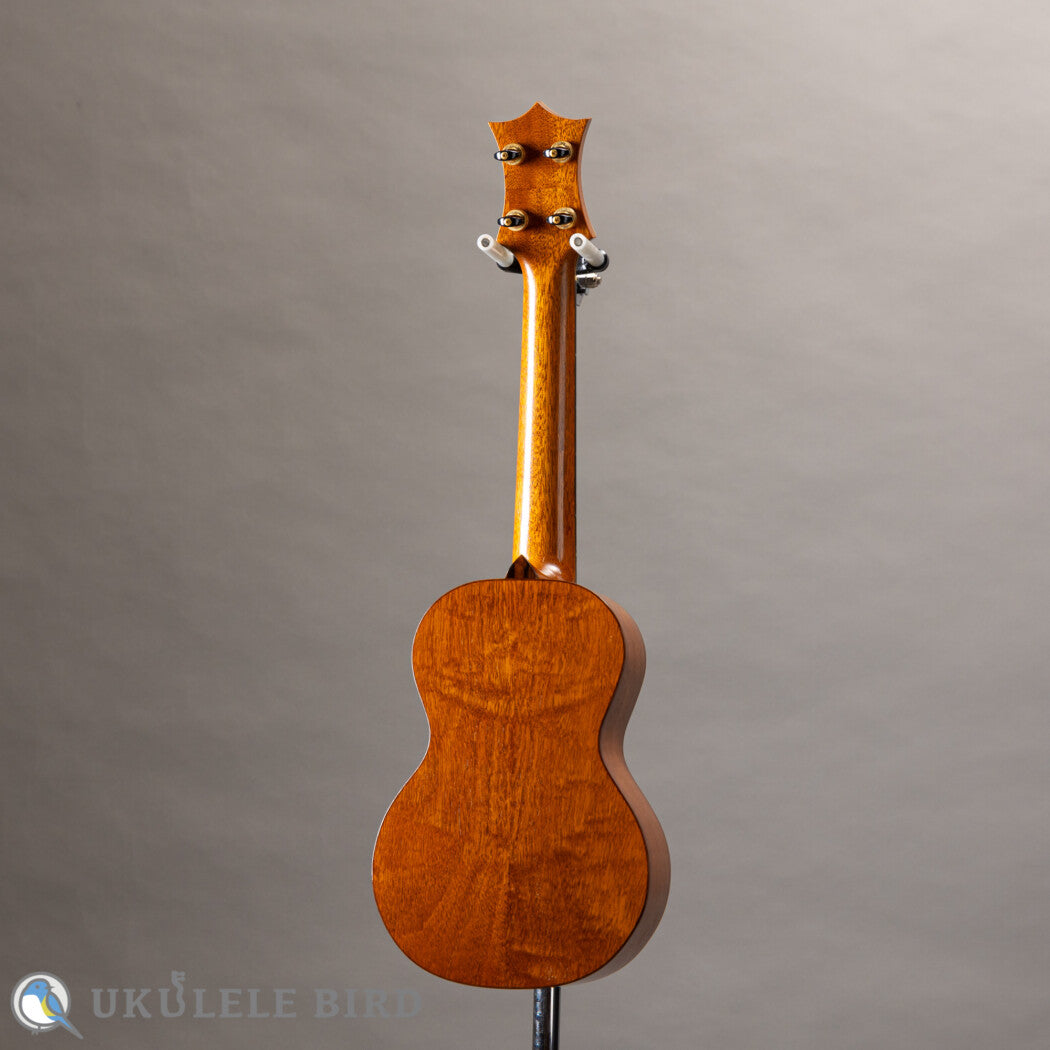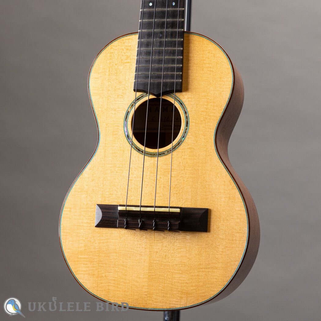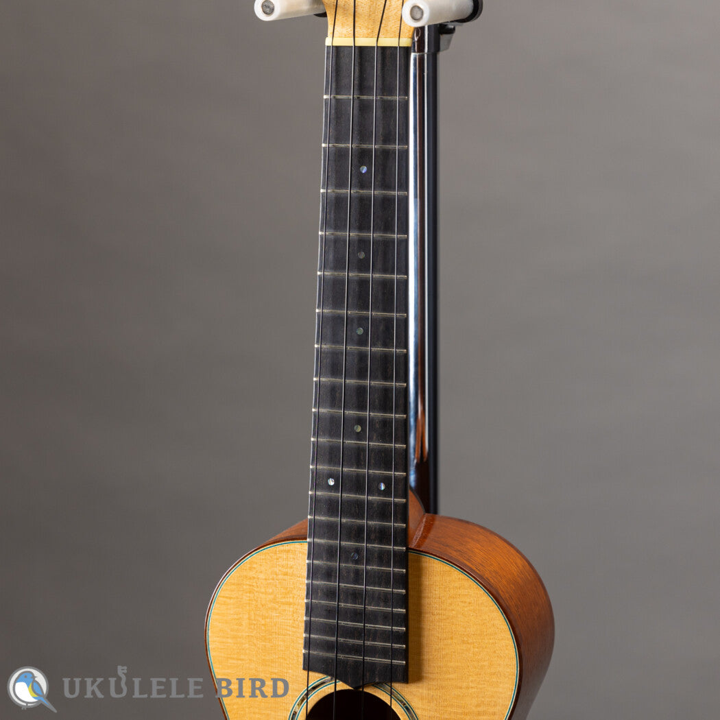 A concert ukulele made with a natural construction method, featuring a spruce top and mahogany back and sides.
