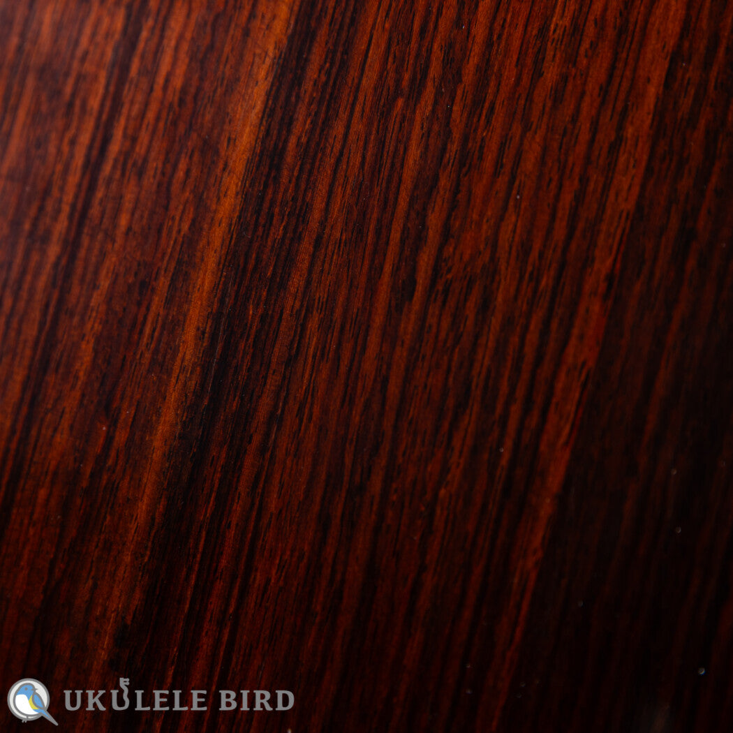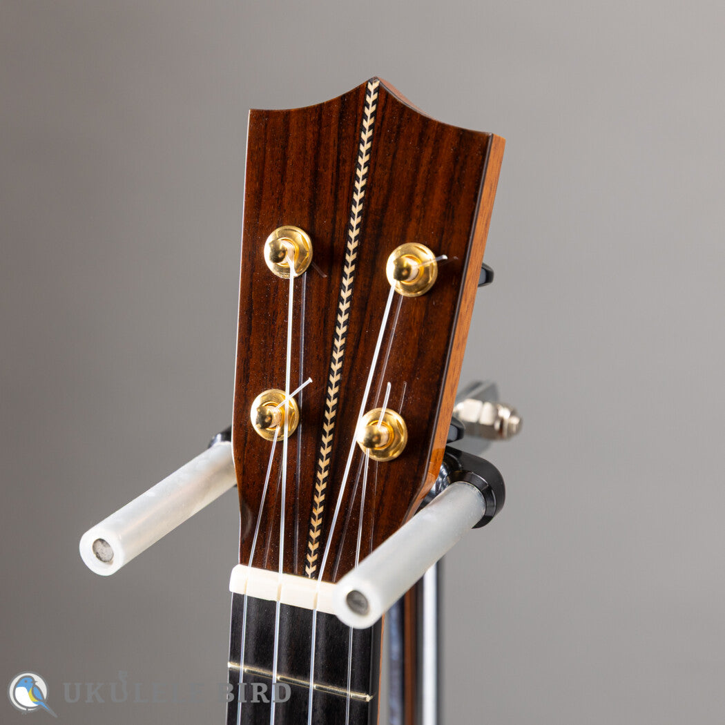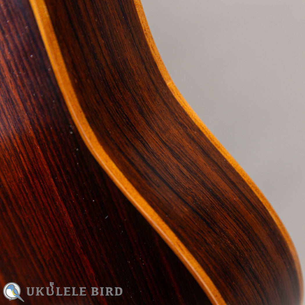 This instrument was made in 2024, has a soprano long neck size, a spruce top and rosewood back and sides. It has herringbone purfling, a rope center line on the head plate, and a pickguard made of rosewood, making it look gorgeous and attractive. It is in mint condition with no scratches, making it a great used bargain. The hard case is also clean and shows no signs of use.