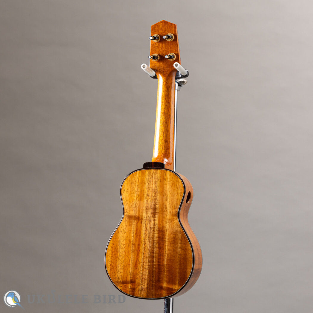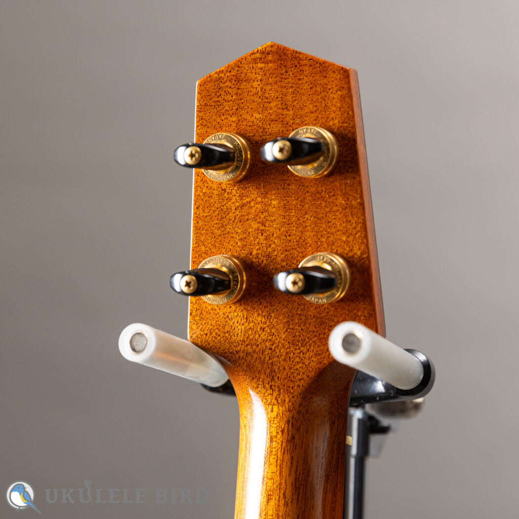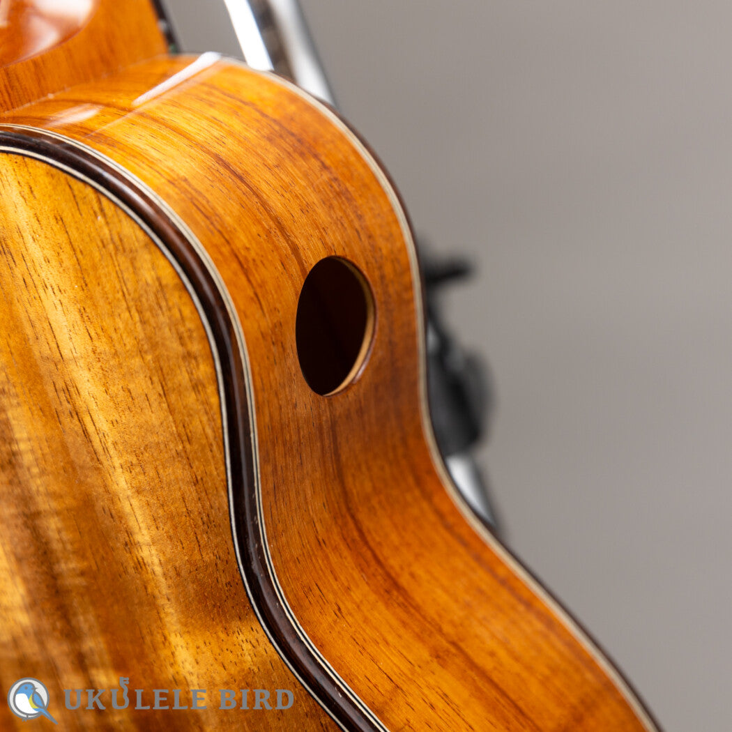 This show model uses Sitka spruce for the top, double Hawaiian Koa and maple for the sides, and Hawaiian Koa for the back, producing a voluminous sound despite being a soprano.