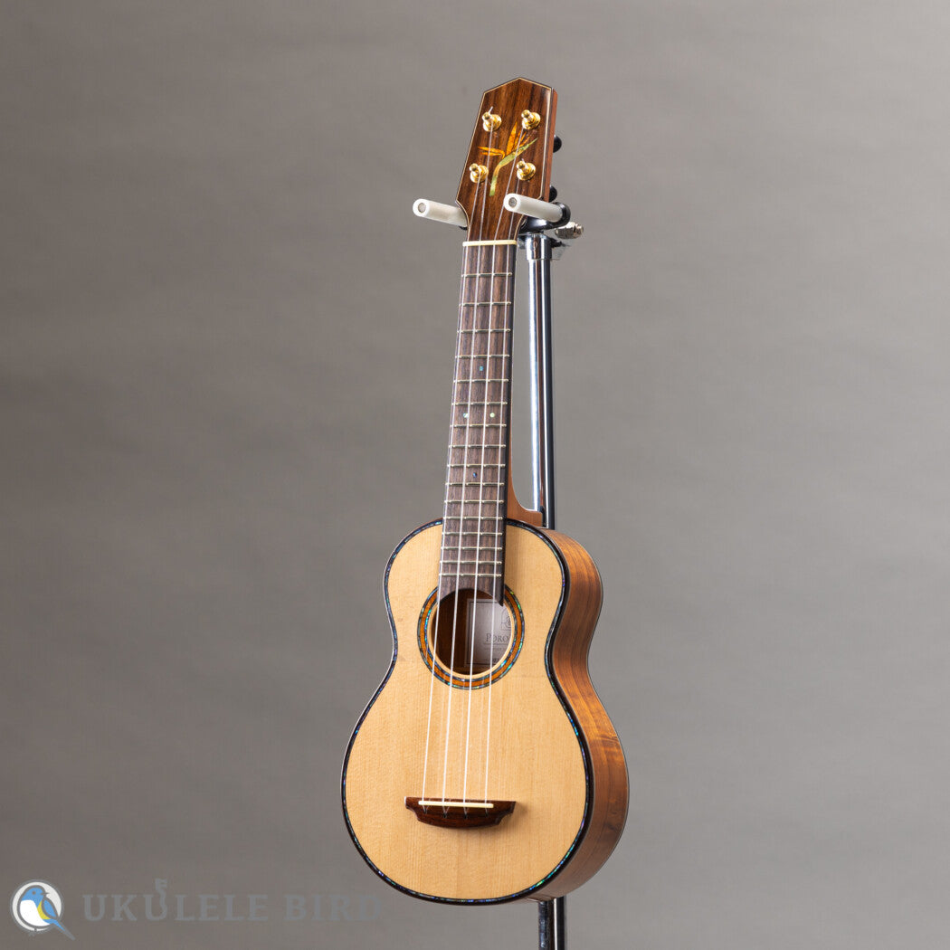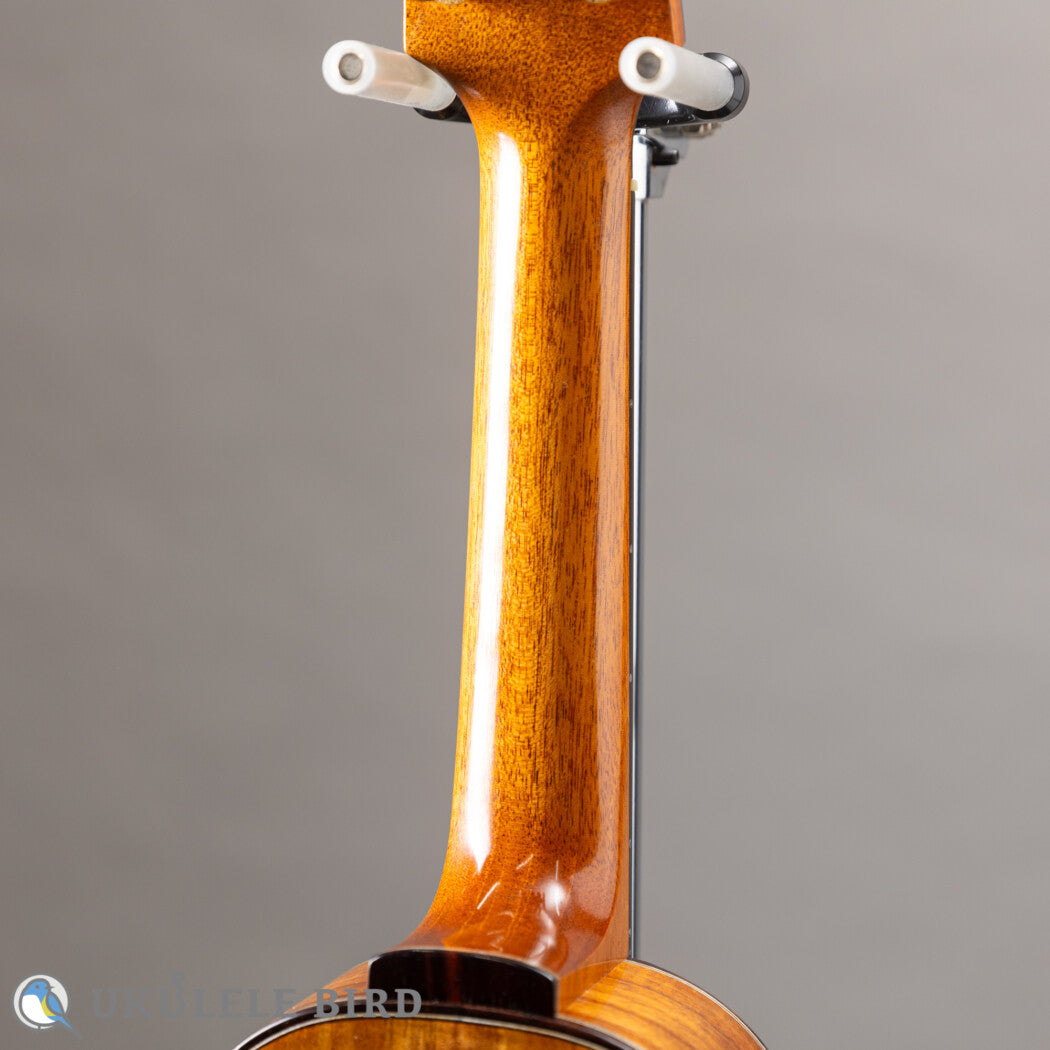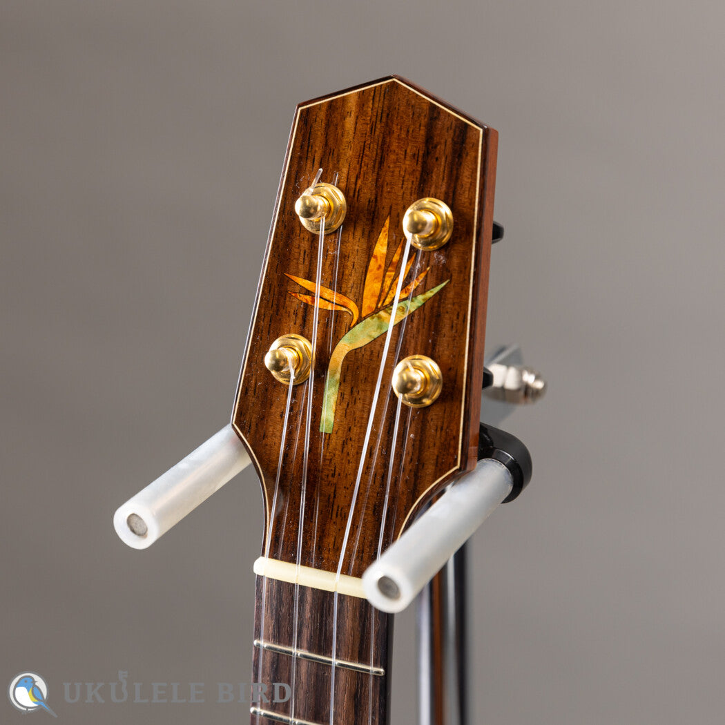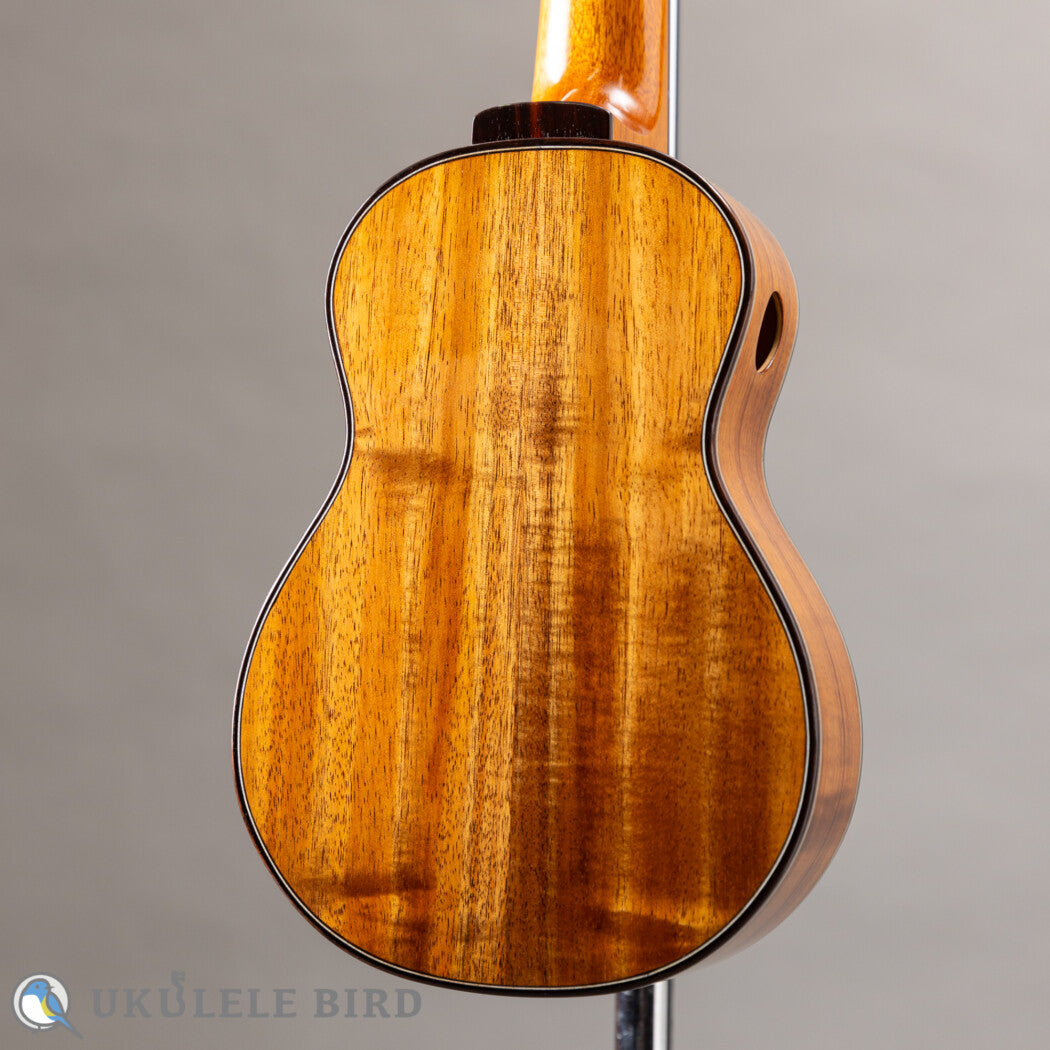 This show model uses Sitka spruce for the top, double Hawaiian Koa and maple for the sides, and Hawaiian Koa for the back, producing a voluminous sound despite being a soprano.