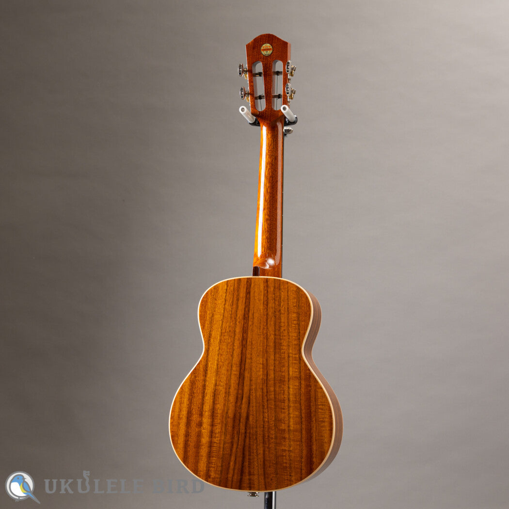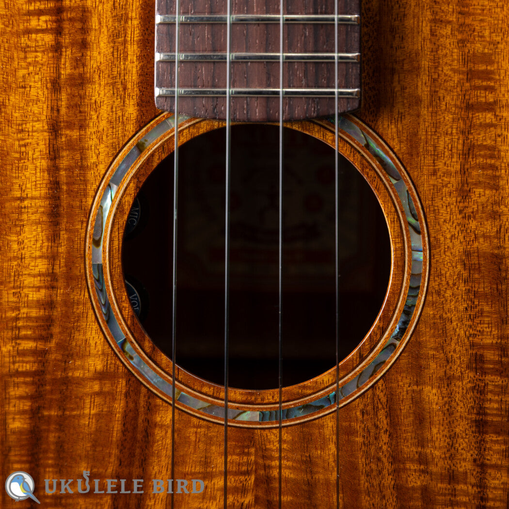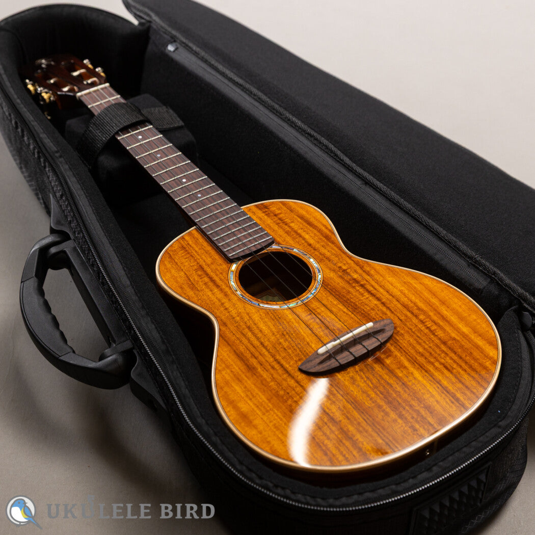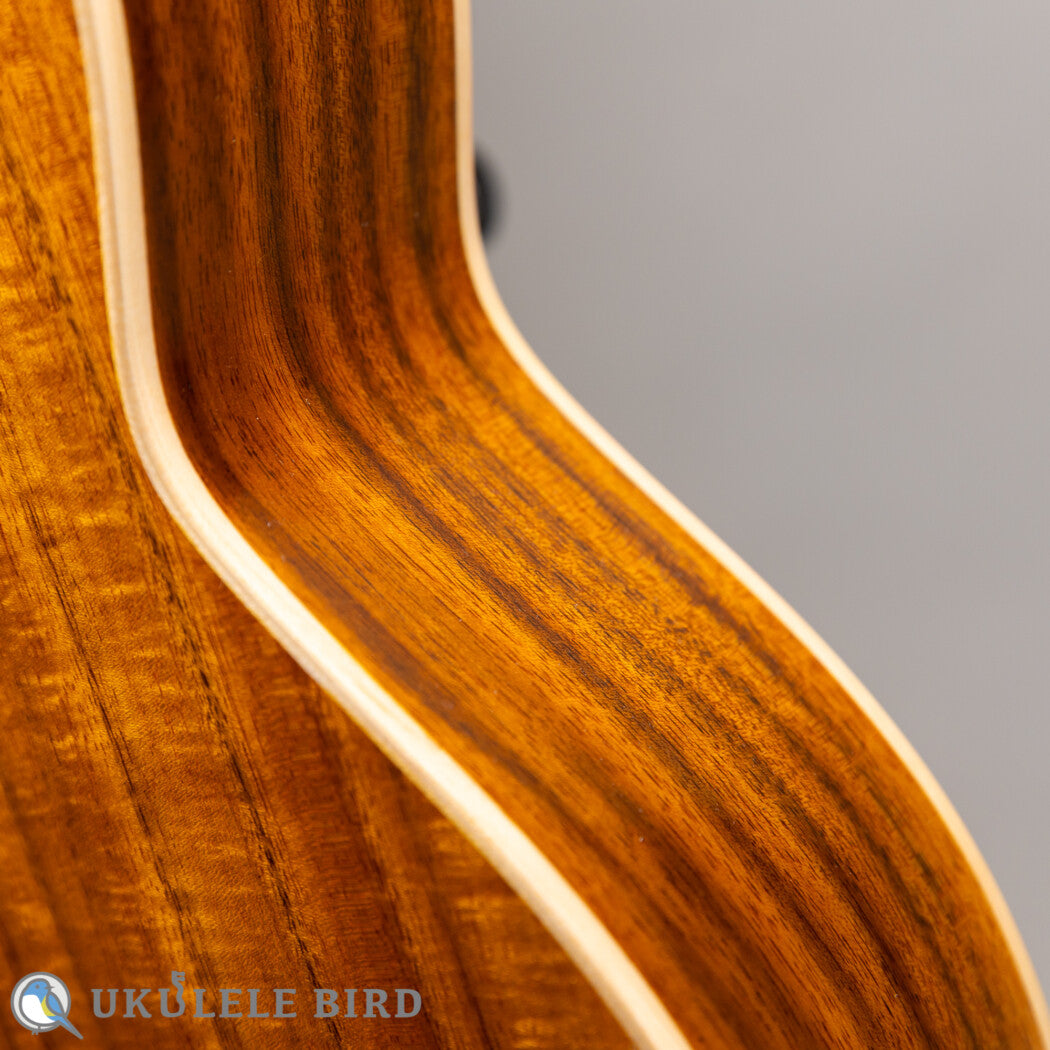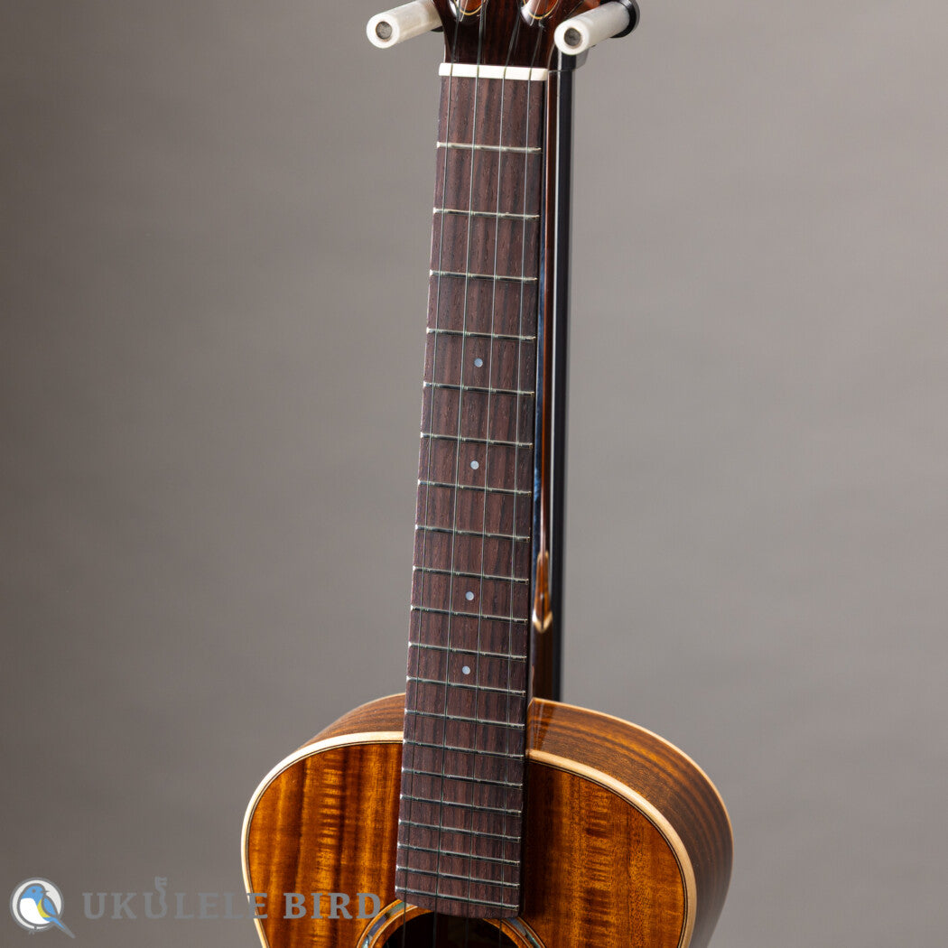 見た目、サウンド共にハワイアンコアに近い特性を持つ台湾アカシア材を用いて製作された日本限定モデル。スケール430mmのテナーサイズ。14Fジョイント・20F仕様。 綺麗な木目と赤褐色の美しい色が美しいです。アヴァロン貝を用いたロゼッタ、ボディ外周にはメイプルでバインディング加工、スロテッドヘッド、塗装は艶のあるグロス仕上げなど、高級感溢れる仕様が満載です。