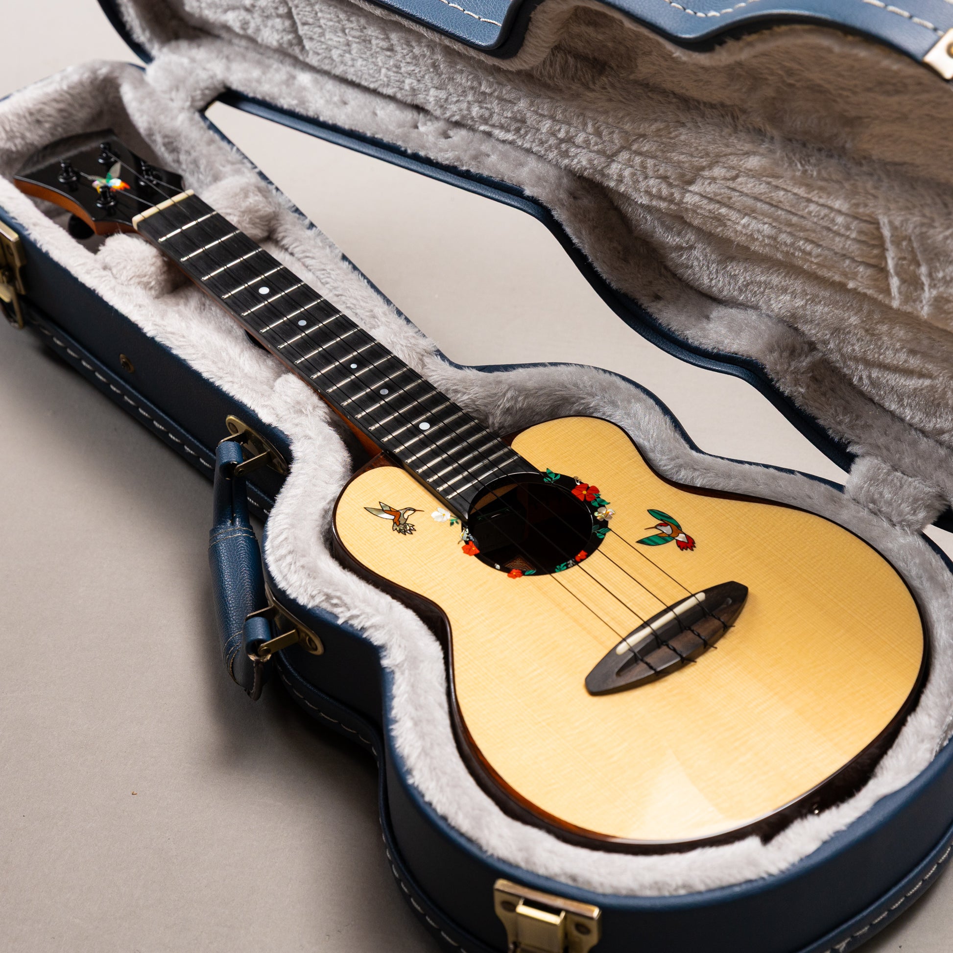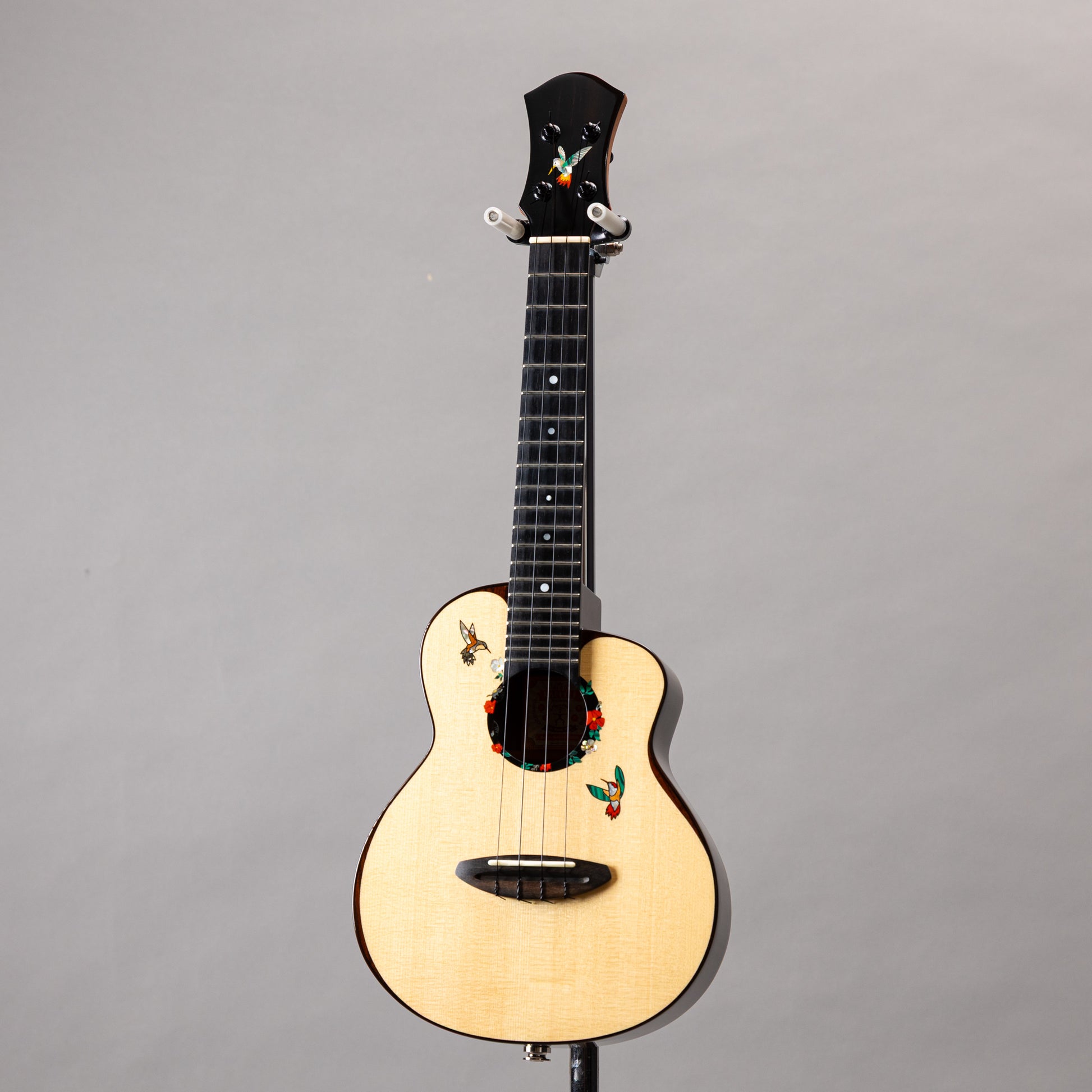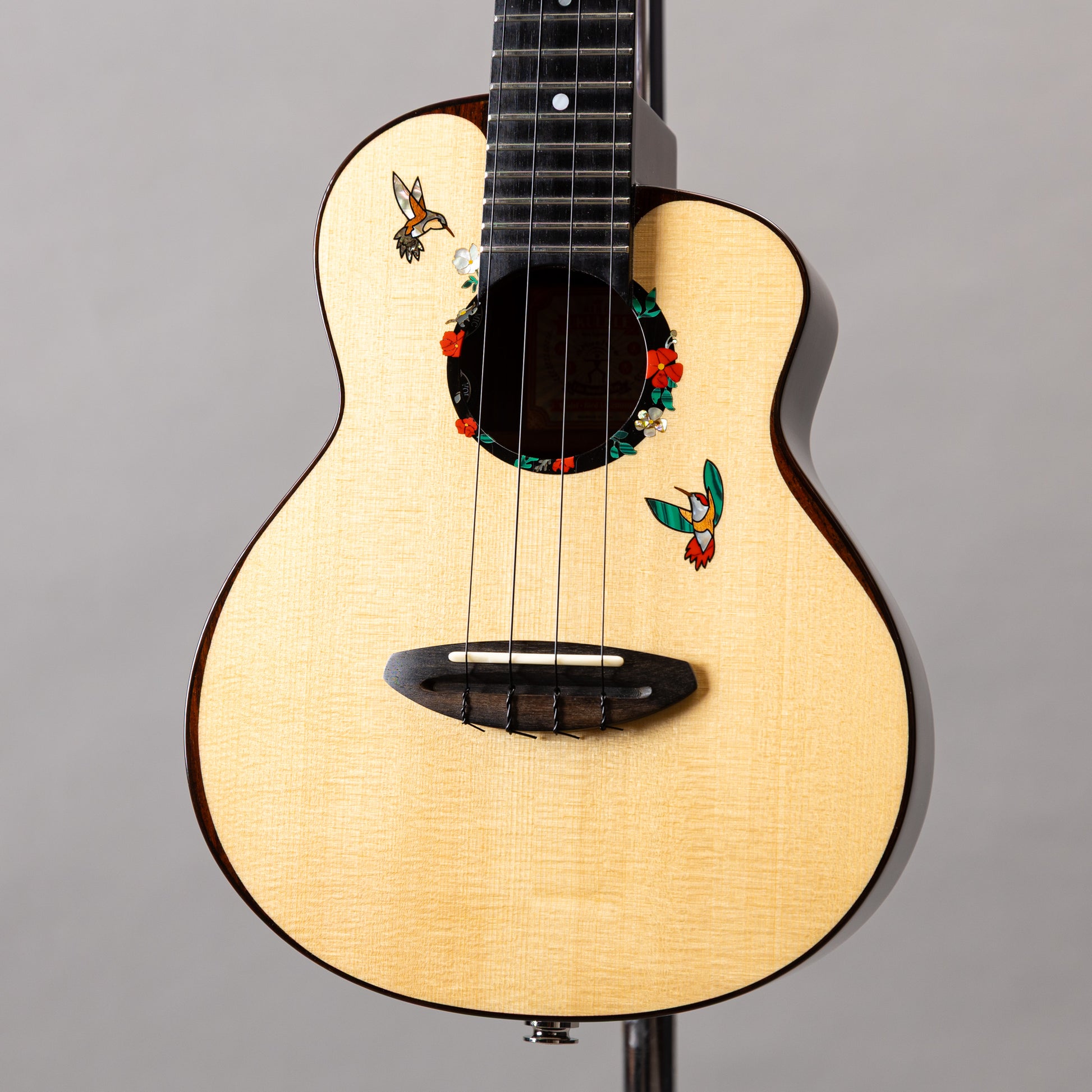 最上級のスイス・ムーンスプルースをトップに使用し、愛らしいハミングバード(蜂鳥)のインレイをあしらった、aNueNueコンサートウクレレの2023年製中古品です。