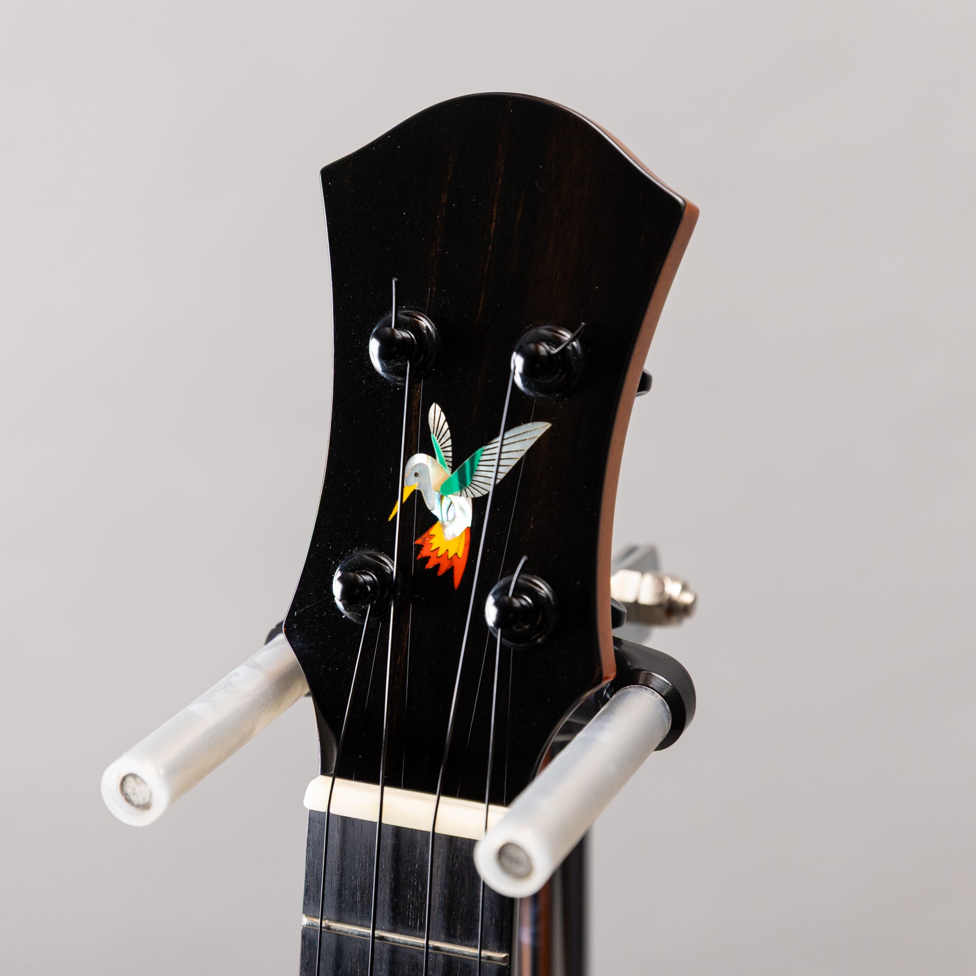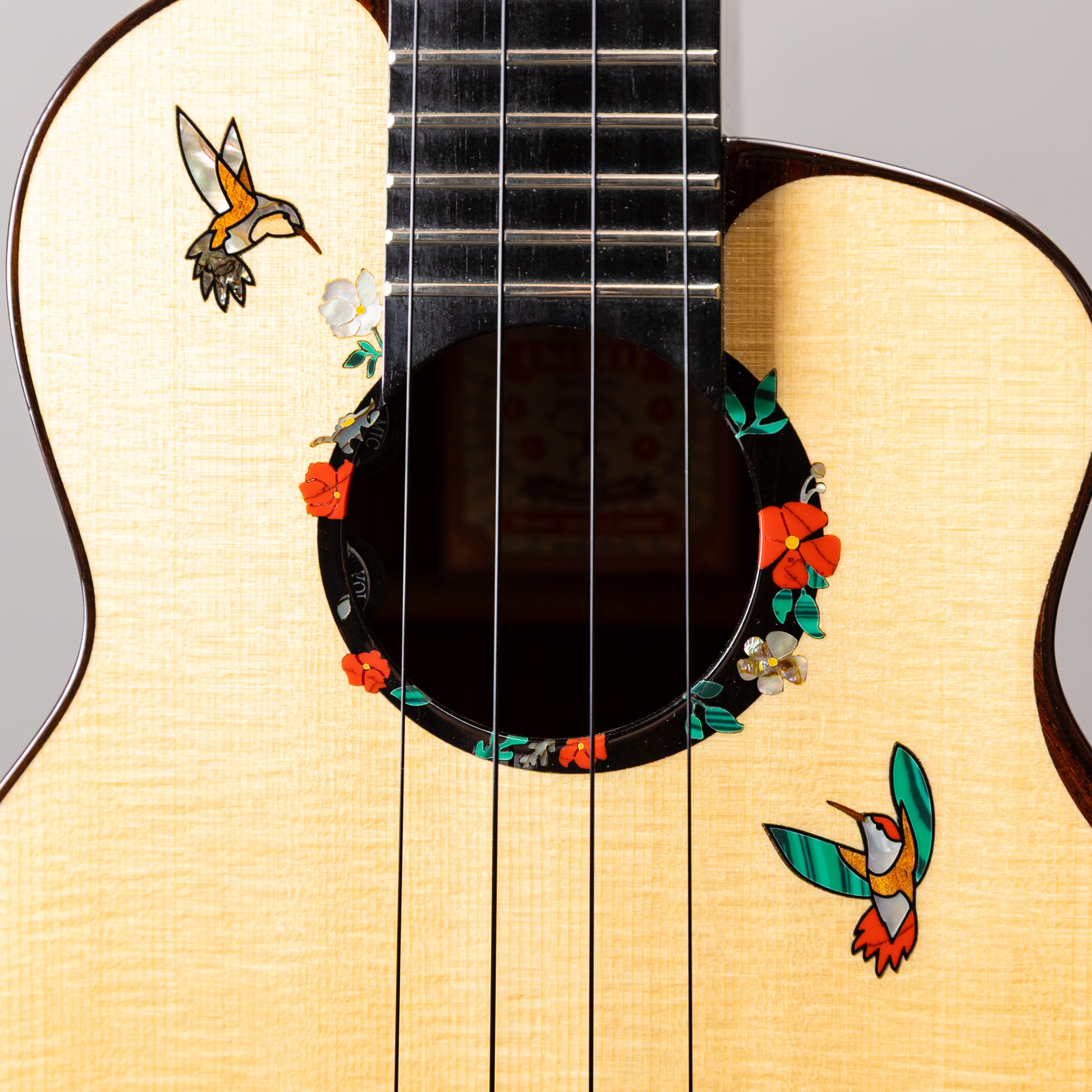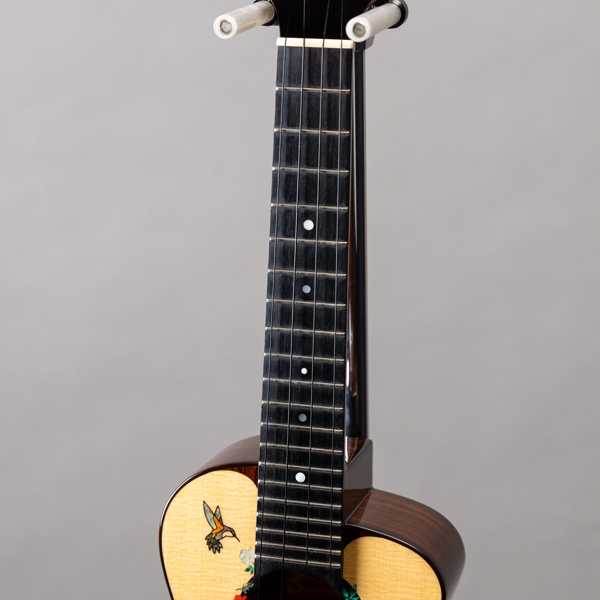 ヘッドには羽ばたく蜂鳥が一羽、ロゼッタには花々と蜜を求めて舞う二羽の蜂鳥をアバロンやマザーオブパール、ターコイズなどの素材で象嵌。華やかで品のあるデザインに仕上げられています。