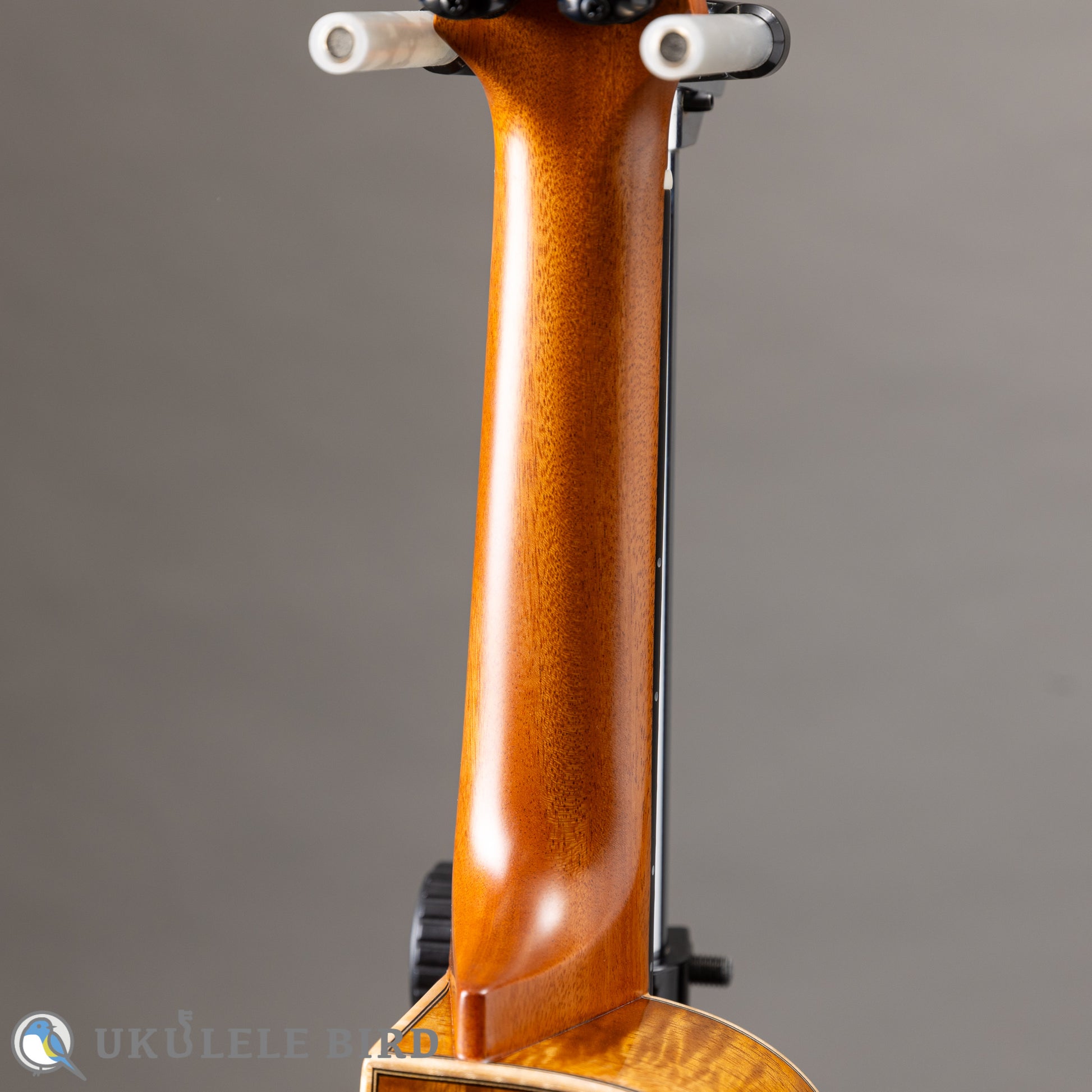 ハワイアンコアを使用したハミングバードシリーズは、カスタムオーダーのみで実現できる希少な仕様です。5周年記念モデルはデザインにさらにアレンジを加え、ヘッドにフラワーインレイを加えるなど華麗さを増した形でのリリースとなりました。各サイズ2本のみの生産ですが、このソプラノモデルはその中で最後の1本です。