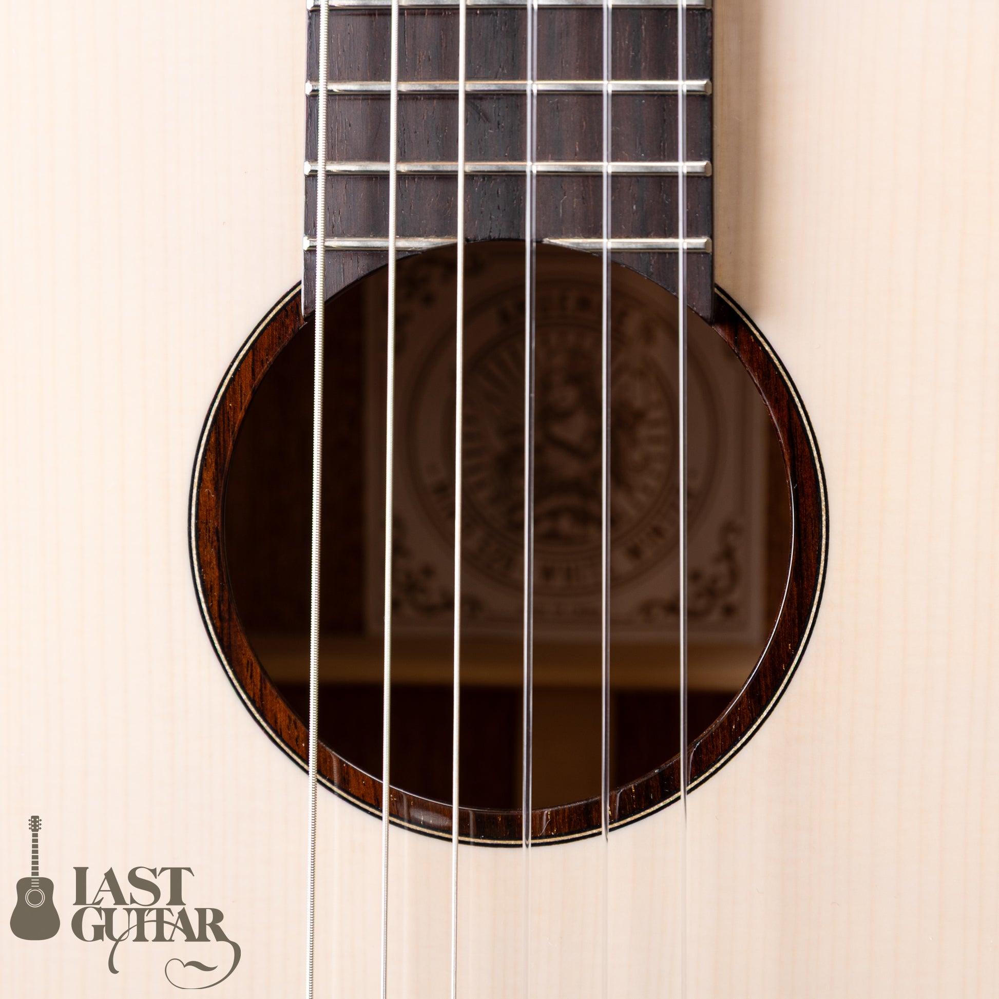 本モデル White Winter はトップにイングルマンスプルース単板を採用し、透明感のあるホワイトフィニッシュをまとったモデルです。ウィンターホワイトのトップに、ローズウッドのバインディングと千鳥柄ペグがアクセントとなり、雪景色のように静かで美しいルックスです。