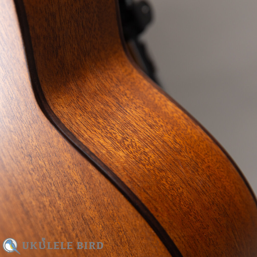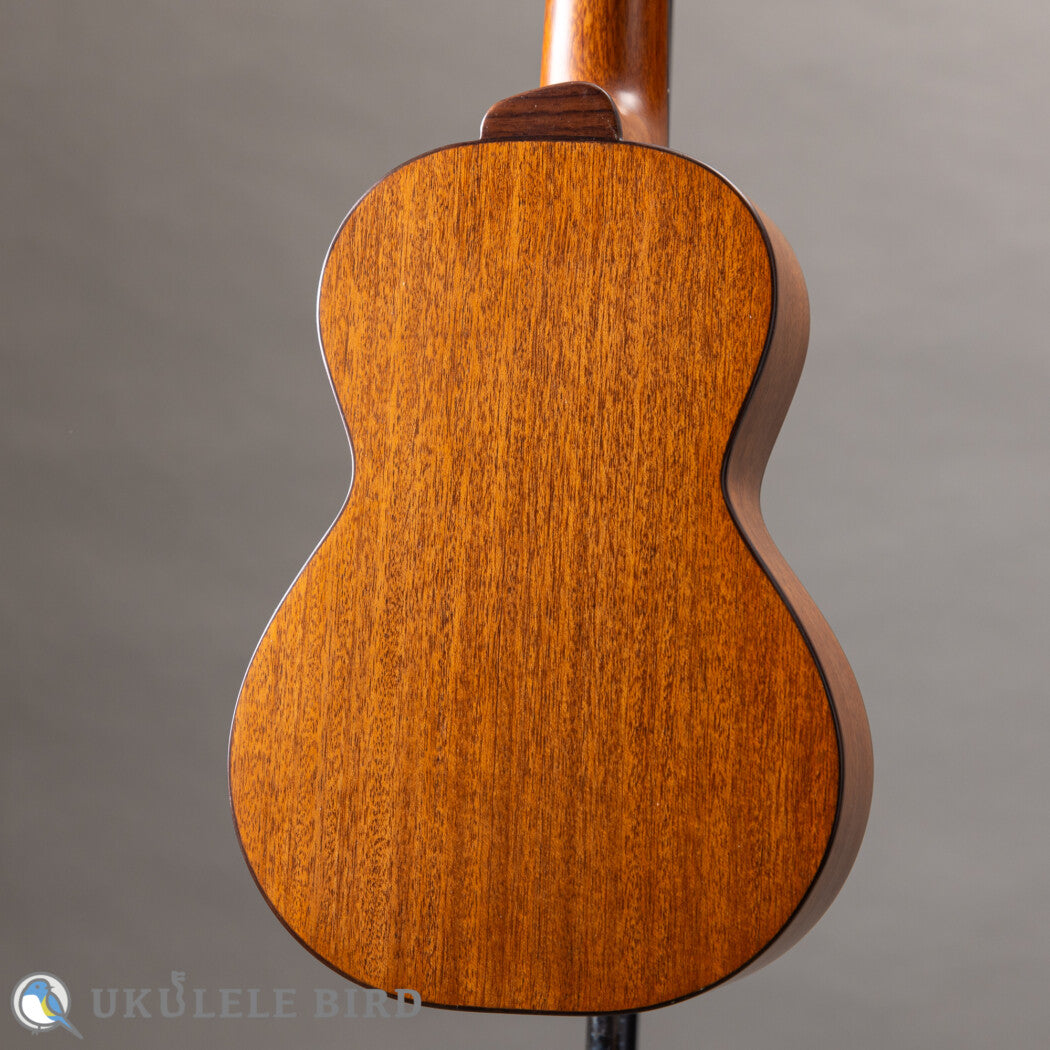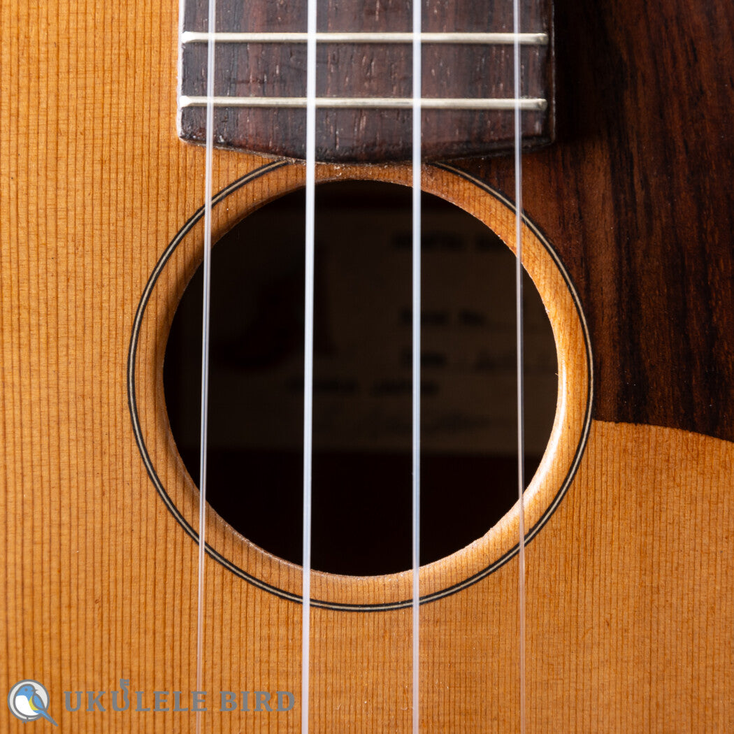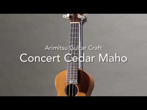 本器は有満氏が得意とするコンサートサイズのウクレレで、十分にエイジングされ目の詰まった、高級ギターで使用されるグレードのレッドシダーをトップに使っています。サイドバックのホンジュラスマホガニーとの調和で繊細かつ伸びのあるサウンドに仕上がっています。