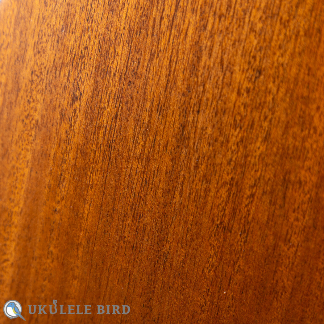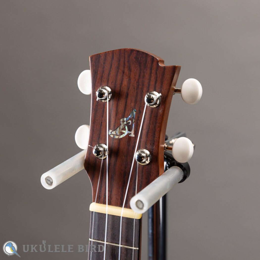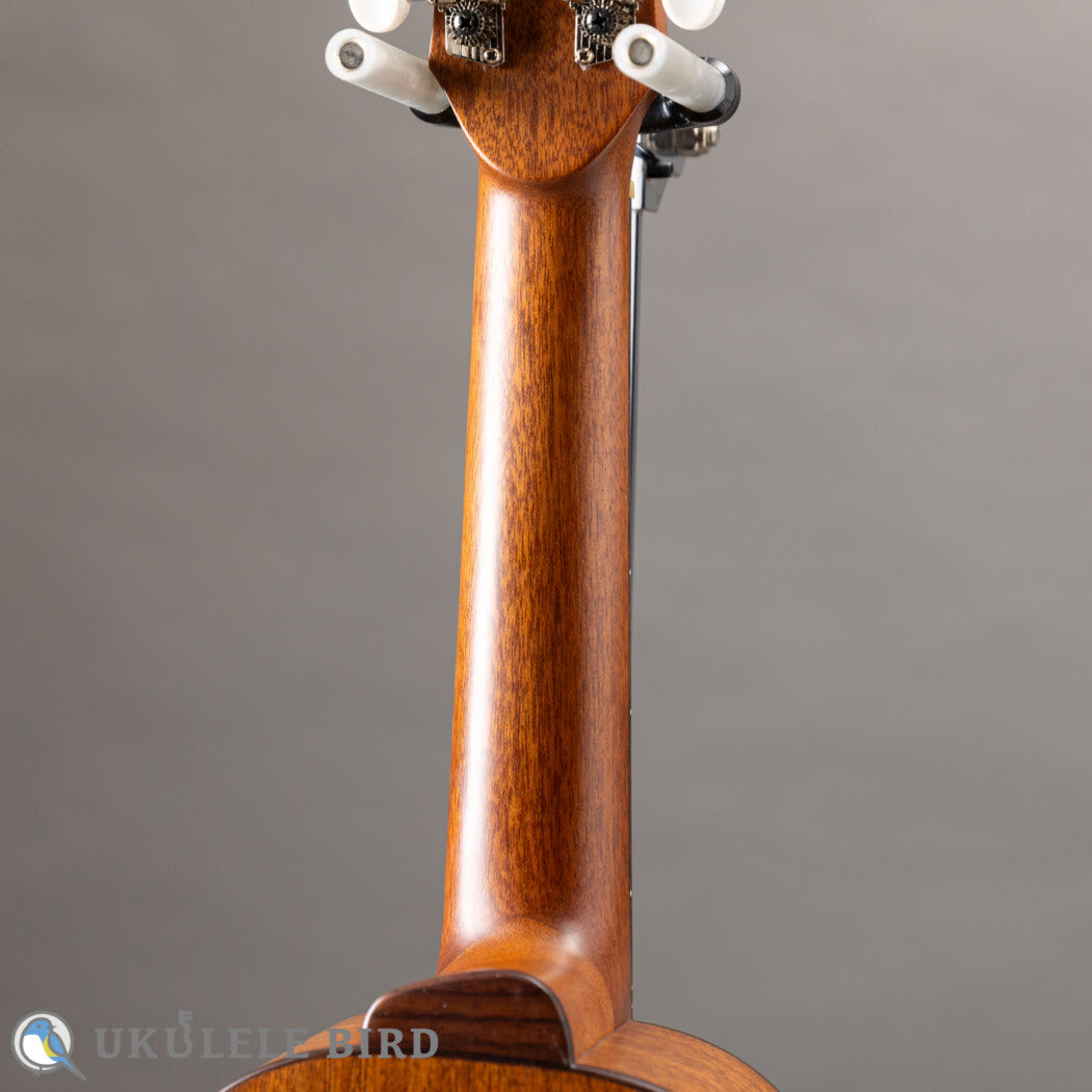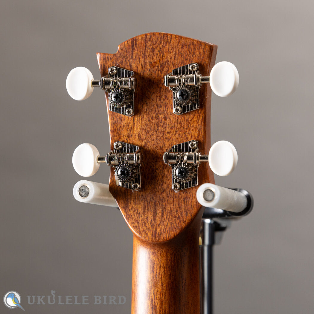 本器は有満氏が得意とするコンサートサイズのウクレレで、十分にエイジングされ目の詰まった、高級ギターで使用されるグレードのレッドシダーをトップに使っています。サイドバックのホンジュラスマホガニーとの調和で繊細かつ伸びのあるサウンドに仕上がっています。