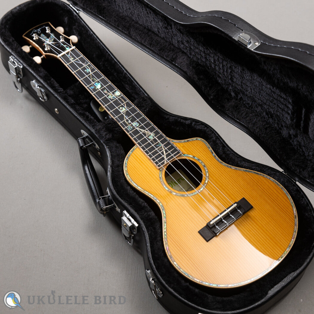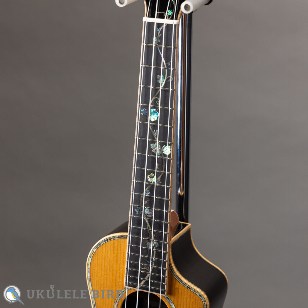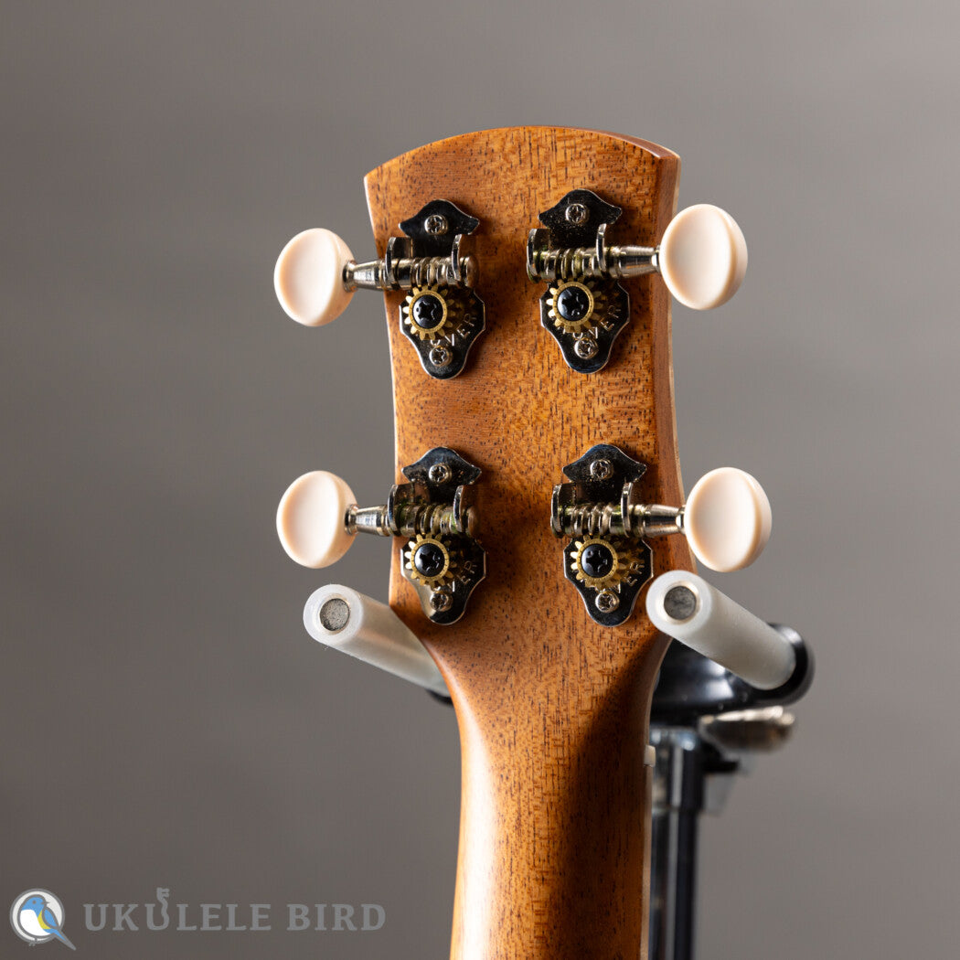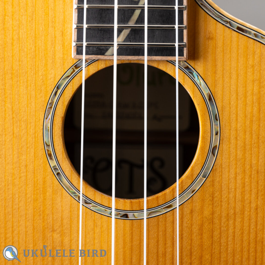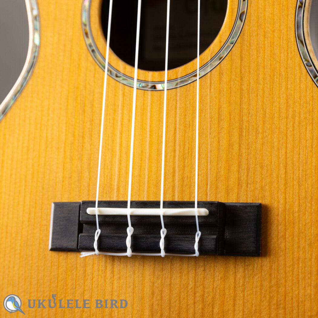 こちらのウクレレは、2024年夏にエアーズのベトナム工場を訪れた当店スタッフが、ウクレレバードの5周年記念モデルとして特別にオーダーしたものです。ボディサイズはコンサートで、弦長は通常より少し長めの400mmです。トップには、アコースティックギターで使われる高級な「ベイクドアディロンダックスプルース」を使用。これにより、新品でもヴィンテージのような深みのある音色が得られます。サイド・バックには、ウクレレには珍しい高級素材「アフリカンブラックウッド」が使われています。
