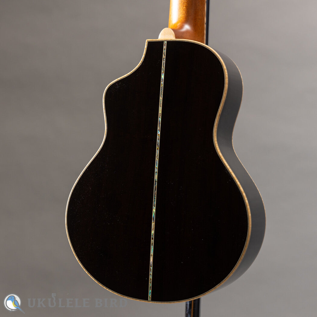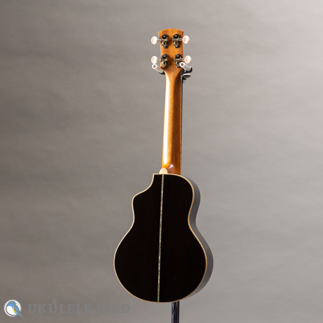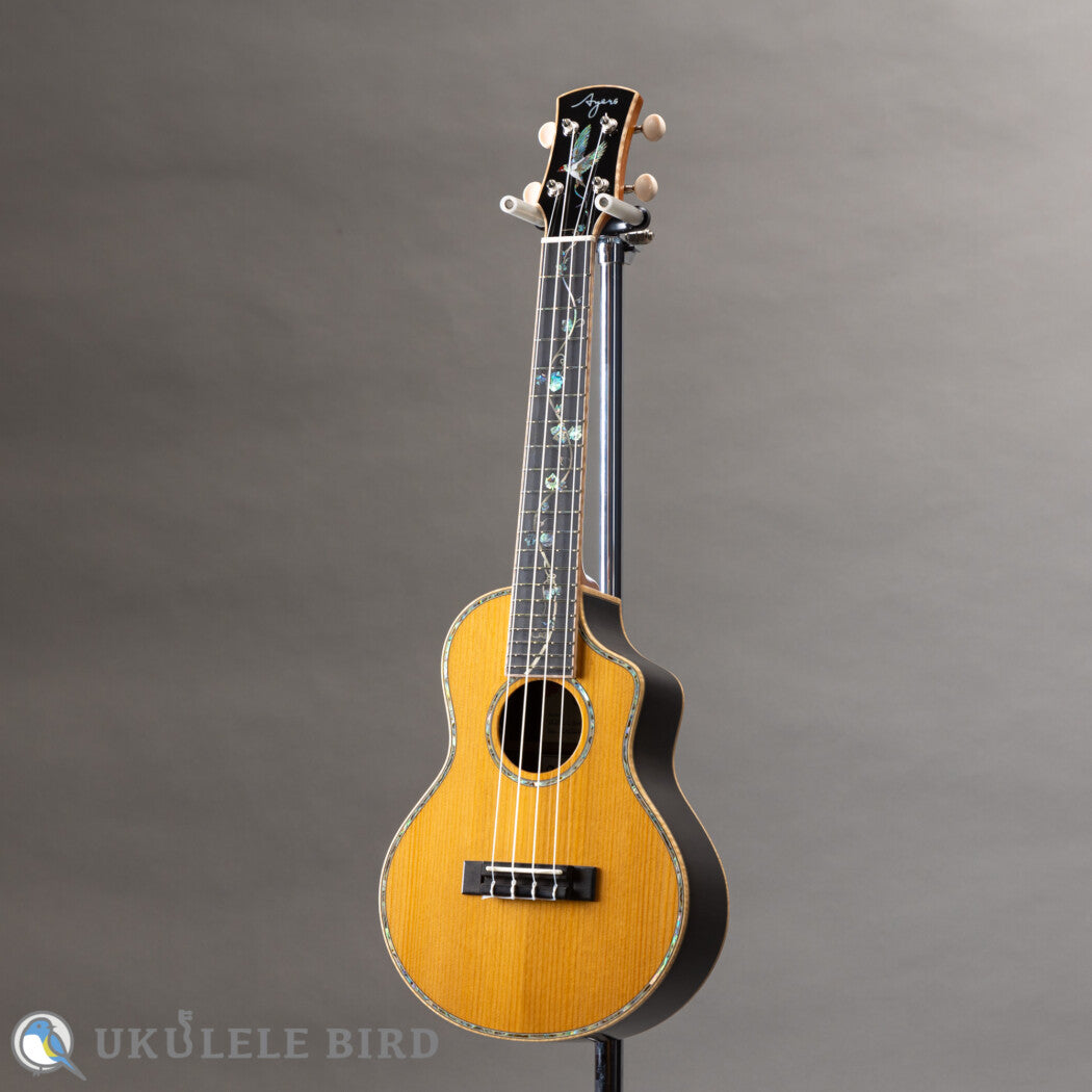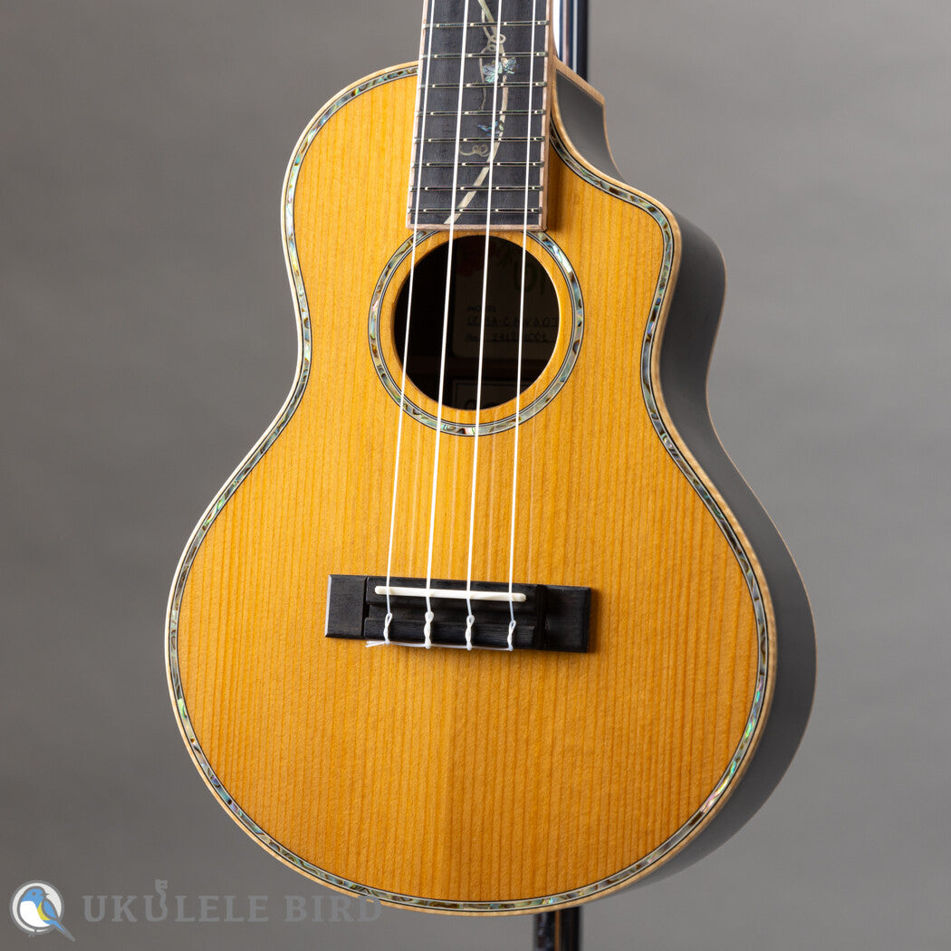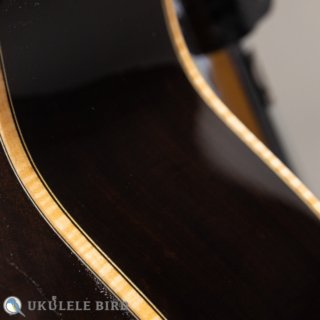 こちらのウクレレは、2024年夏にエアーズのベトナム工場を訪れた当店スタッフが、ウクレレバードの5周年記念モデルとして特別にオーダーしたものです。ボディサイズはコンサートで、弦長は通常より少し長めの400mmです。トップには、アコースティックギターで使われる高級な「ベイクドアディロンダックスプルース」を使用。これにより、新品でもヴィンテージのような深みのある音色が得られます。サイド・バックには、ウクレレには珍しい高級素材「アフリカンブラックウッド」が使われています。