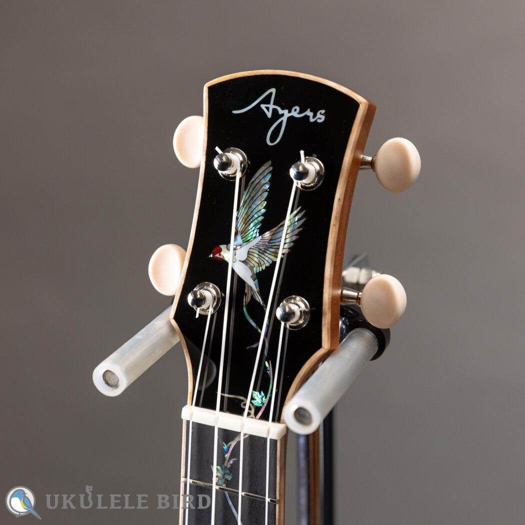 また、エアーズは精巧なインレイ技術に自信を持っており、記念モデルにふさわしい特別なデザインを施しました。ヘッドには「鳥」のインレイ、指板には「ツリーオブライフ」のインレイがあります。