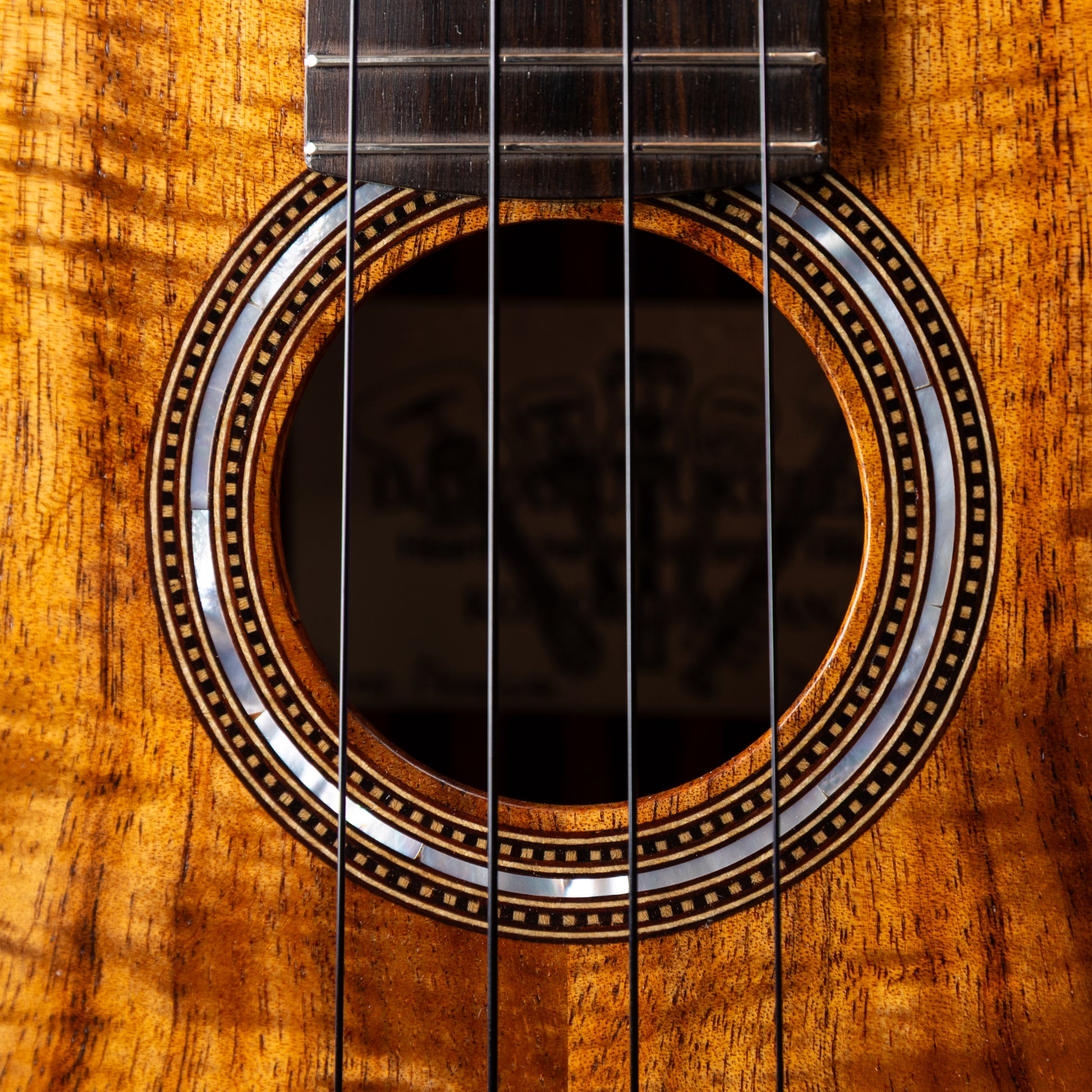 ボディにはプレミアムグレードのハワイアンコアを贅沢に使用しています。ハワイアンコアならではの明るさに加えて、この楽器の独特な形状と張られているナイロン弦の特性も相まって、丸みも感じる音色です。