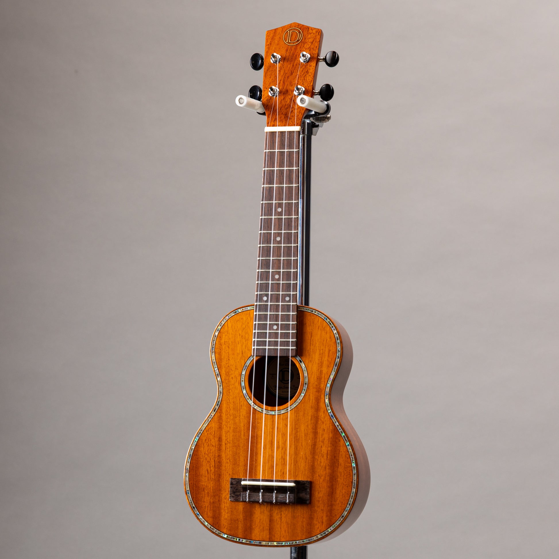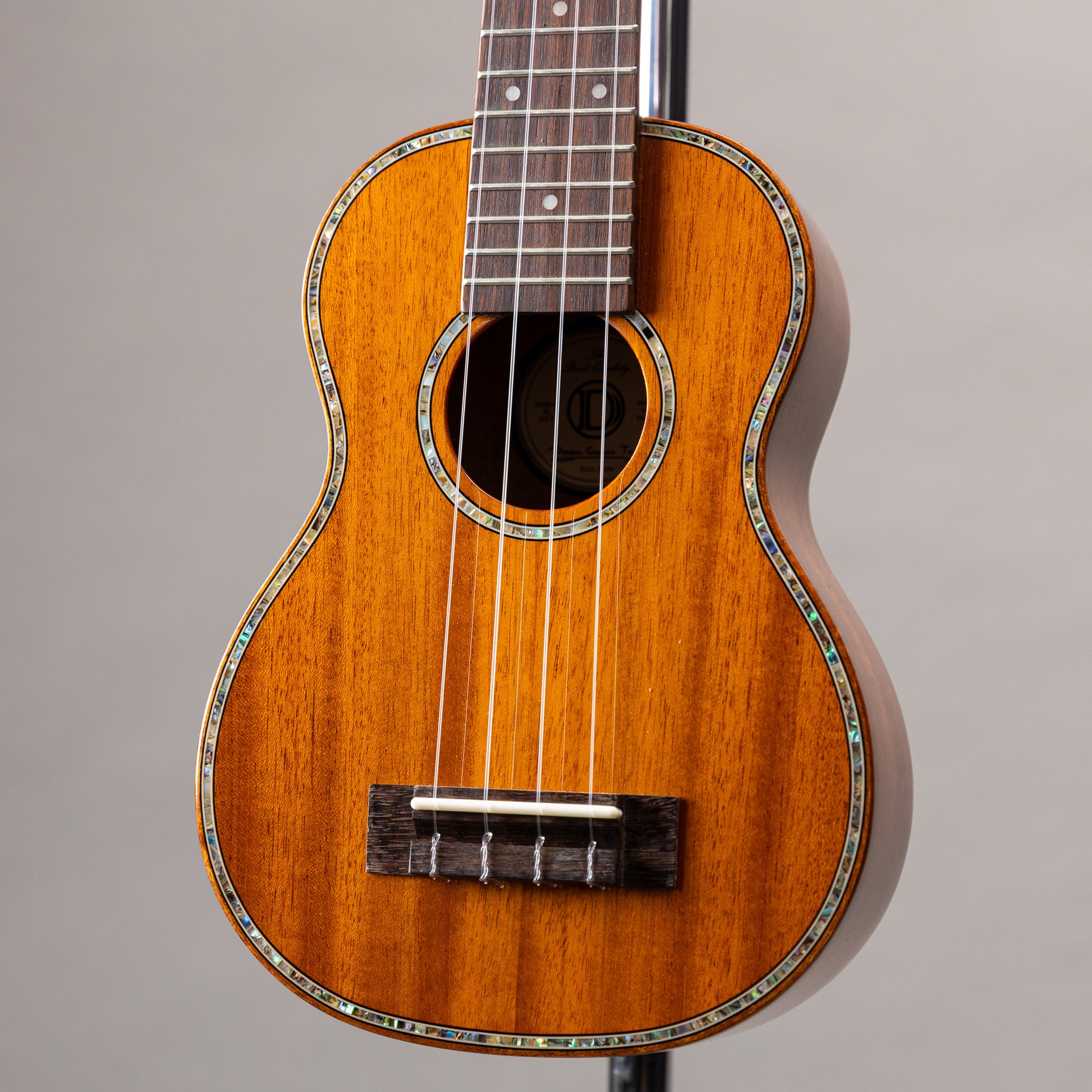 アバロンのパーフリングとロゼッタが美しく輝き、マホガニーバインディングとのコントラストが上品で、シンプルながらも存在感のある、美しい仕上がりのウクレレです。