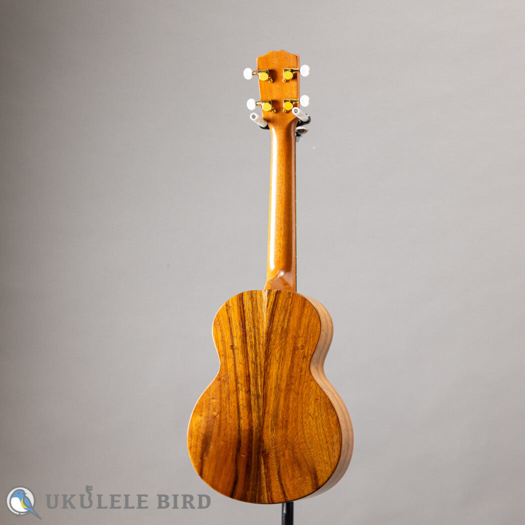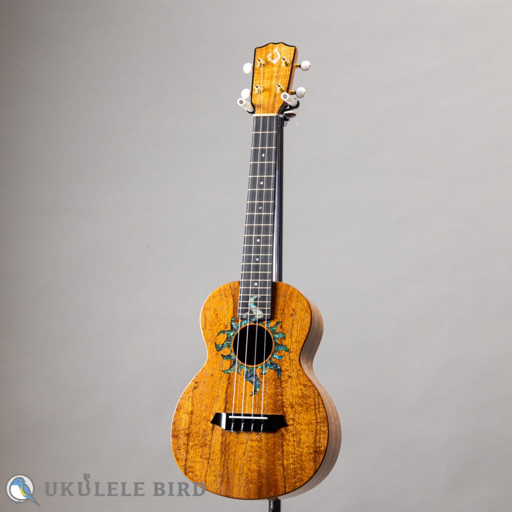 本器 T4 Sun はG Stringを代表するテナーサイズのハイエンドモデルで、杢目の美しいオールハワイアンコアボディに、ヘッドのSun(太陽)インレイが印象的な一本です。