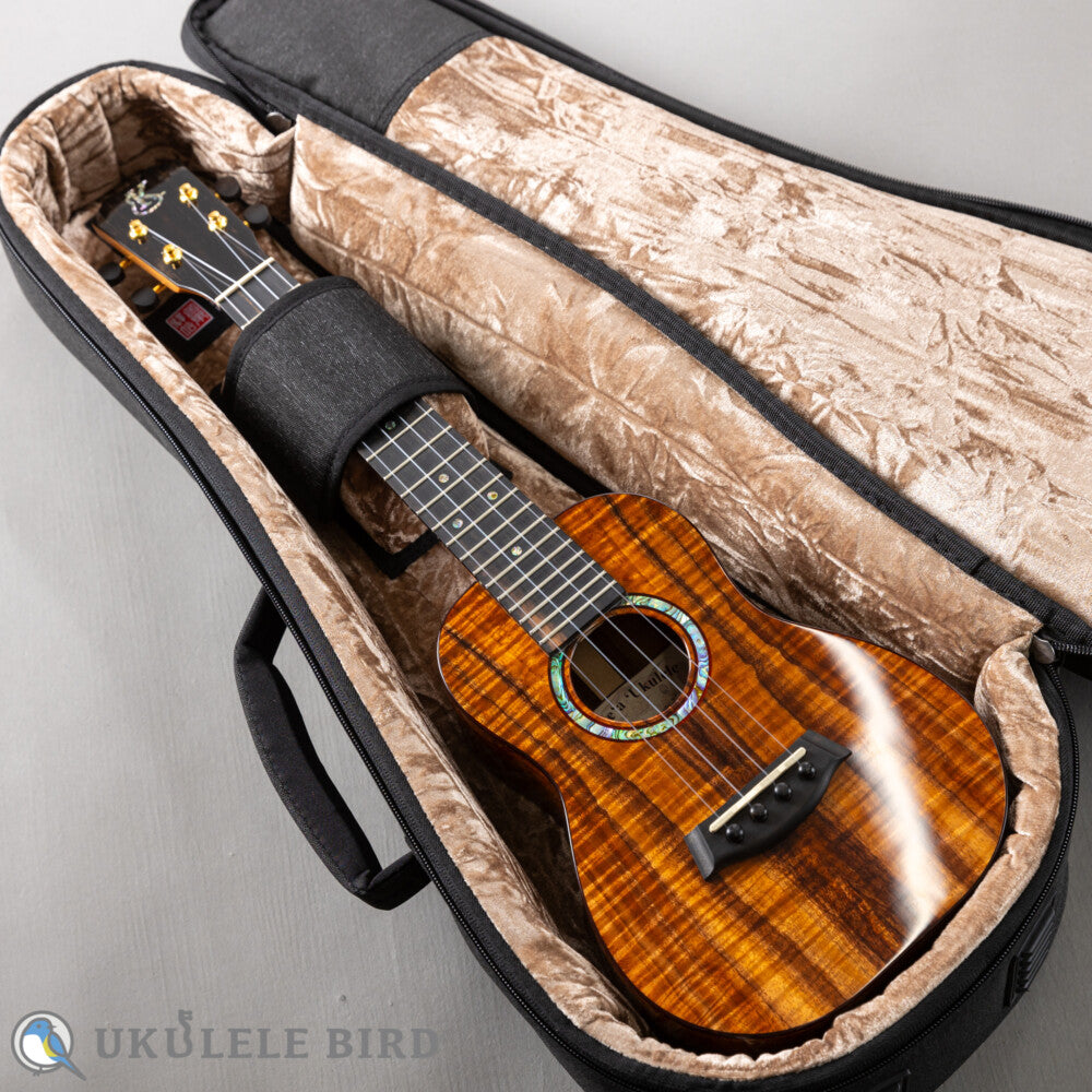 2020年に始まったKPAシリーズは、プレミアムグレードのカーリーコアをボディに使用、サウンドホールロゼッタにはマオリ(ニュージーランド)のパウア貝を大胆にあしらった、デラックスなシリーズです。ハワイのカーリーコアとマオリ(ニュージーランド)のパウア貝を組み合わせることでポリネシアの融合を表してます。