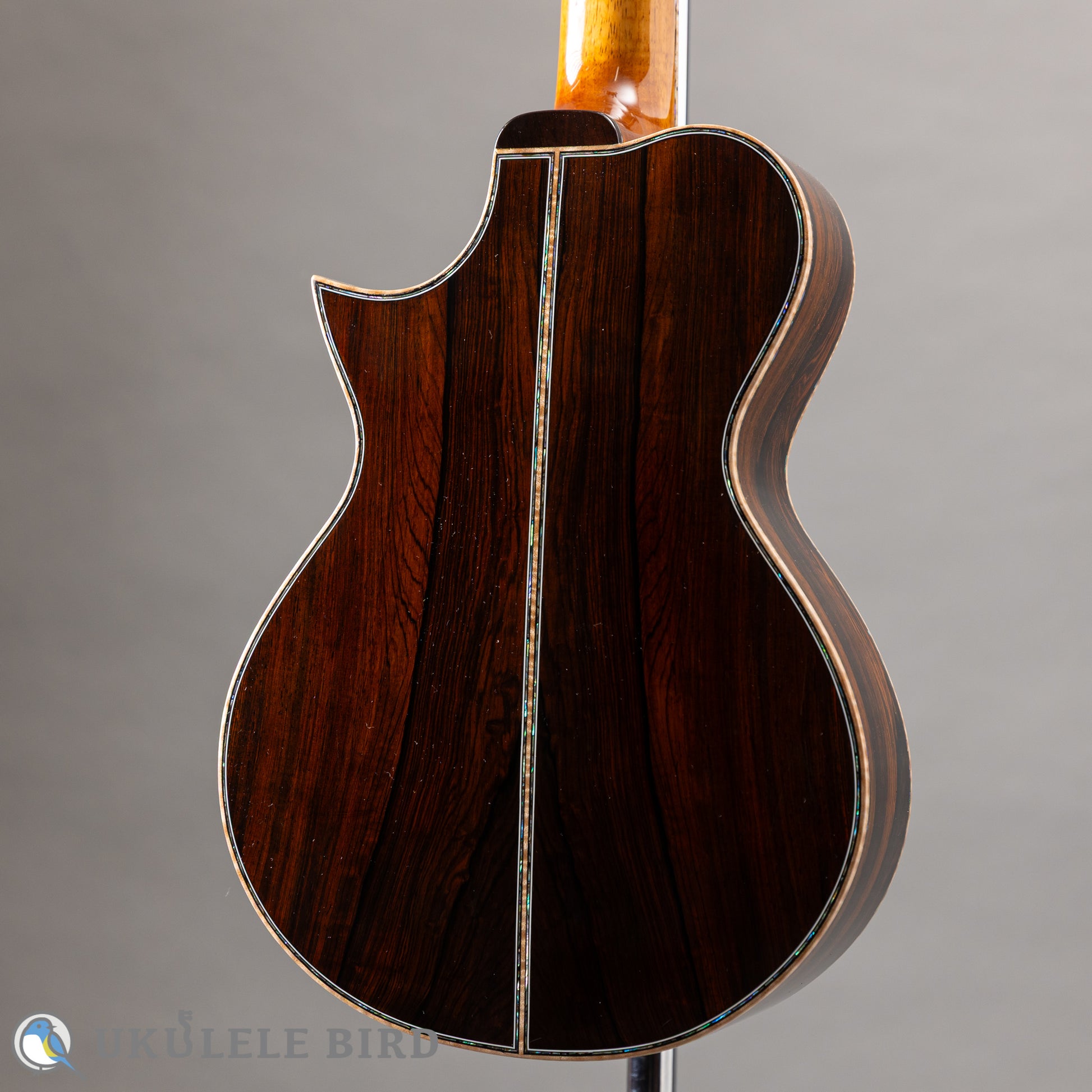 トップには目の詰まった最上級のアディロンダックスプルース、サイドバックはエキゾチックな木目のハカランダ(ブラジリアンローズウッド)を、ネック材料のハワイアンコアは、作家本人がハワイに赴き原木から直接選び抜いた最上級の材を使用。