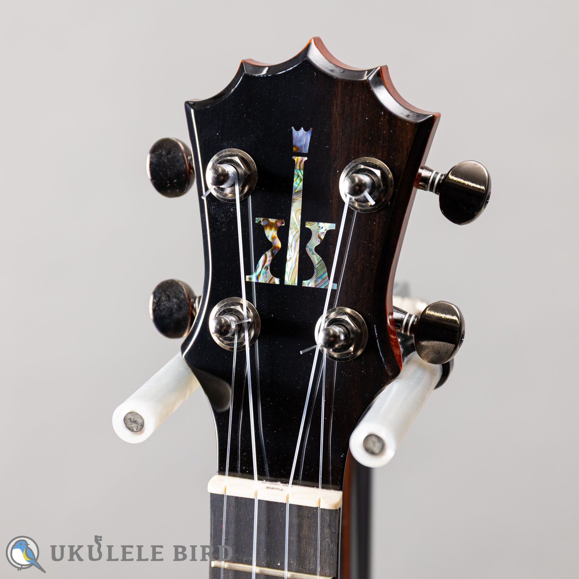 エボニー製ヘッドストックにはアバロンインレイが施され、指板エンドはフラット仕様。