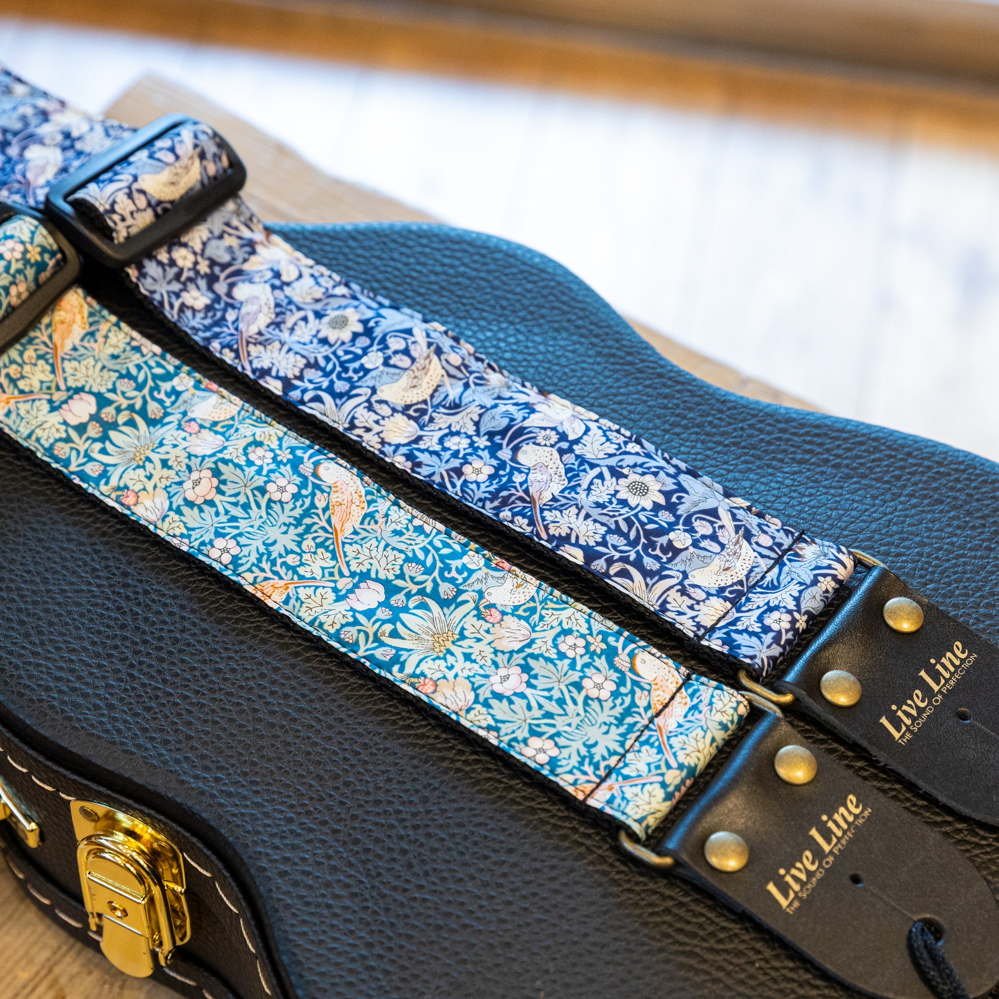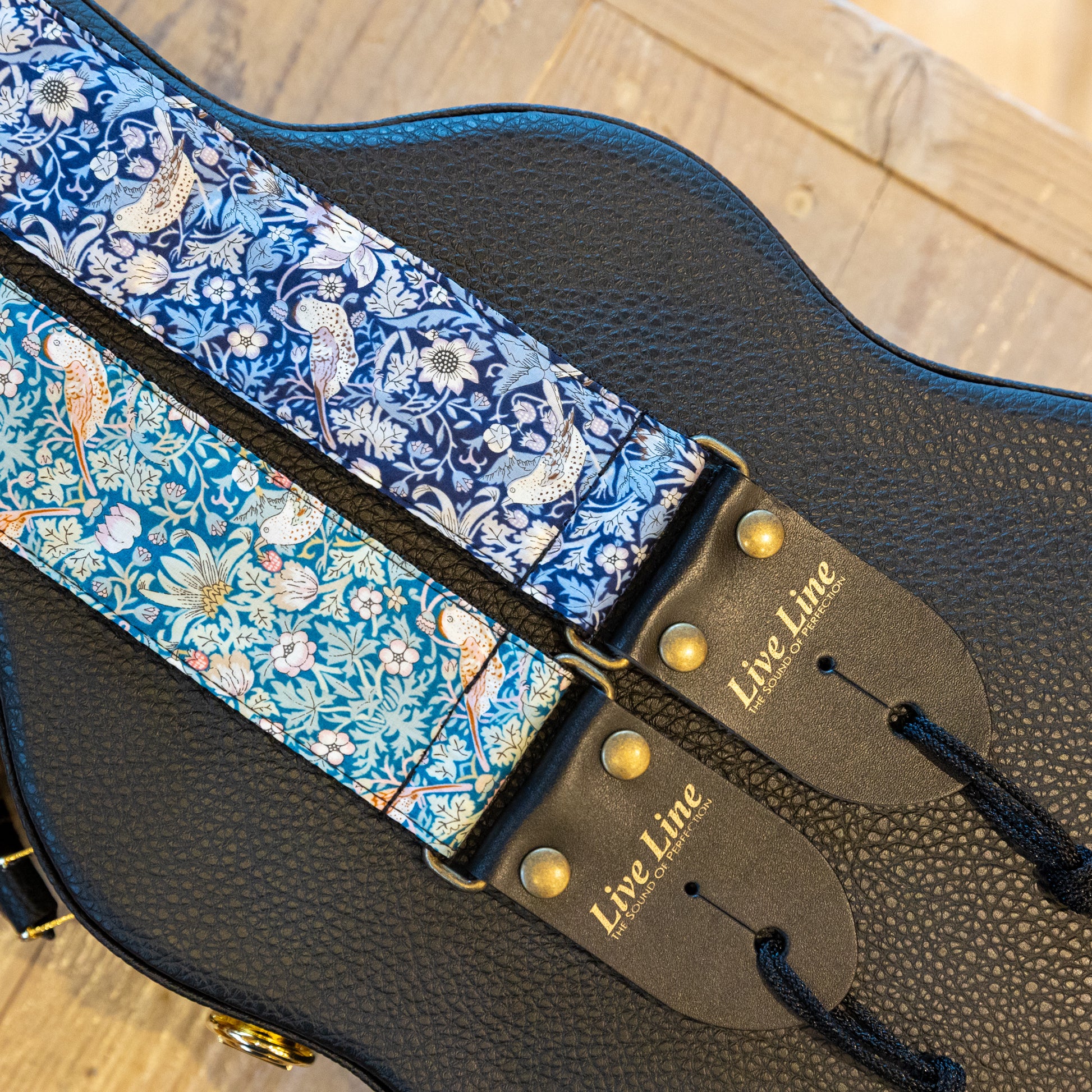 日本製の高品質なストラップブランドLive Line。ウクレレバードがチョイスしたリバティの生地で製作していただいた特注品の太幅ストラップです