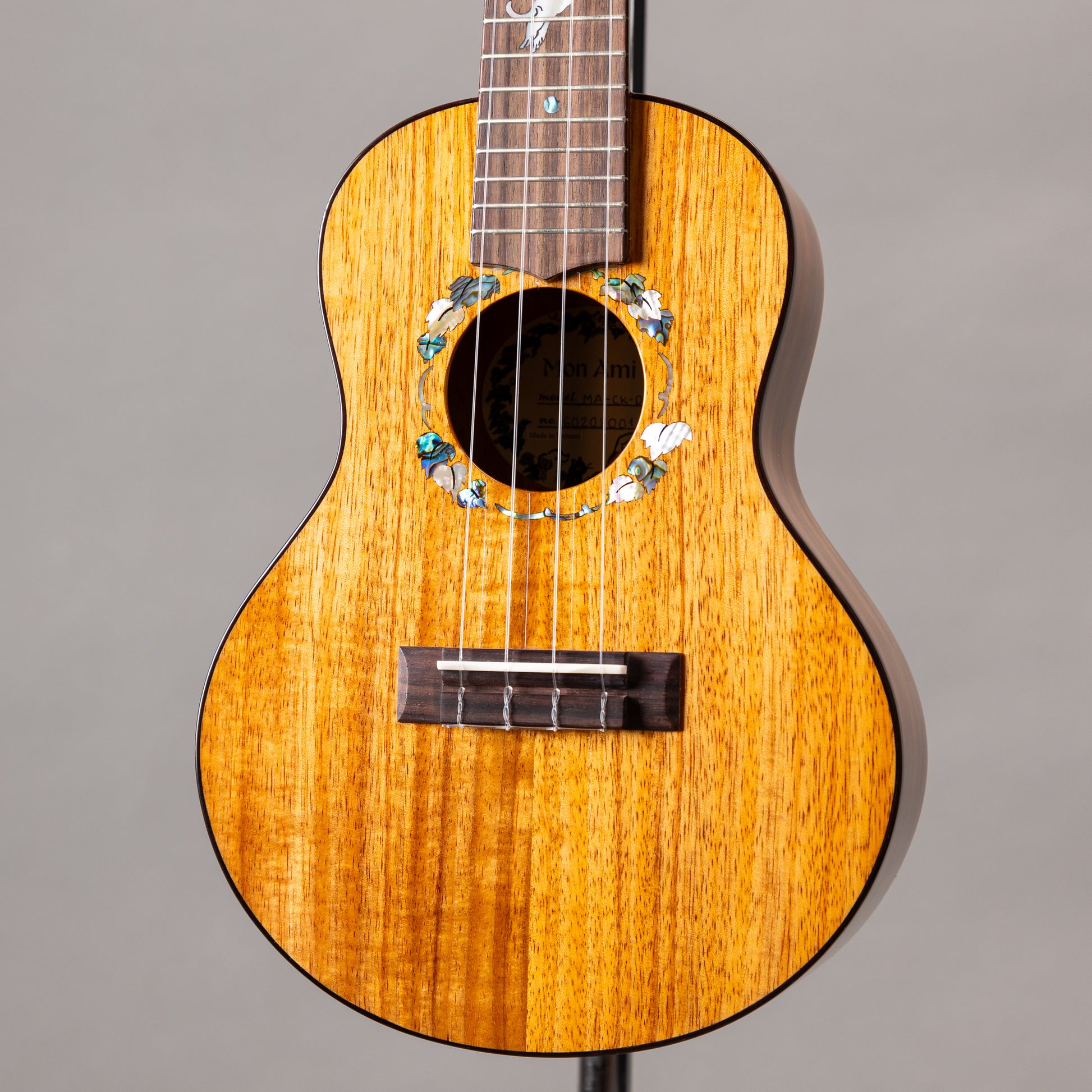 Mon ami(モナミ) はフランス語で「私の友達」を意味し、弾き手に寄り添うウクレレをコンセプトとしてウクレレバードがプロデュースしたブランドである。製造は上質な楽器製作で定評のある Ayers Music が担当し、マホガニー、ハワイアンコア、ホワイトマンゴーなど選び抜かれた単板材を用い、自然な響きを大切に仕立てている。