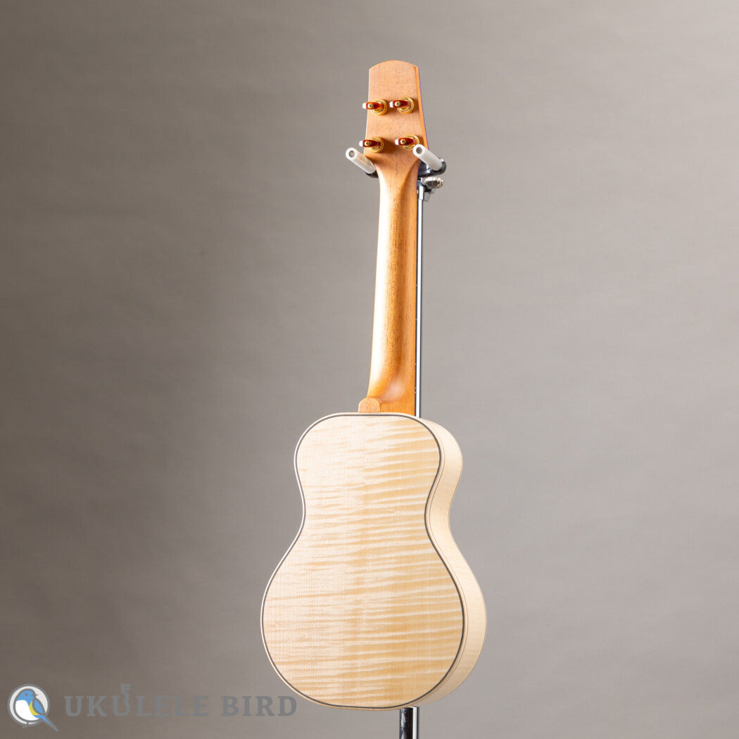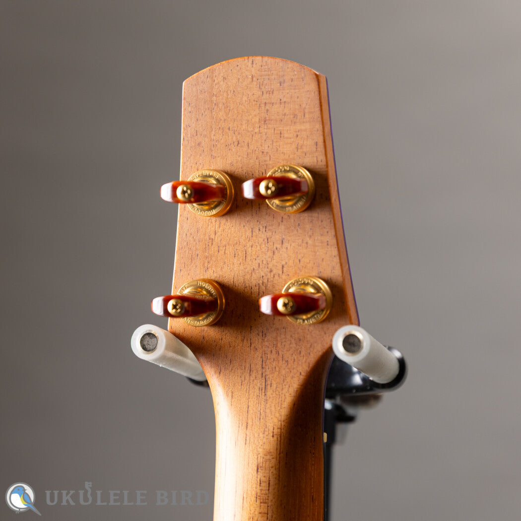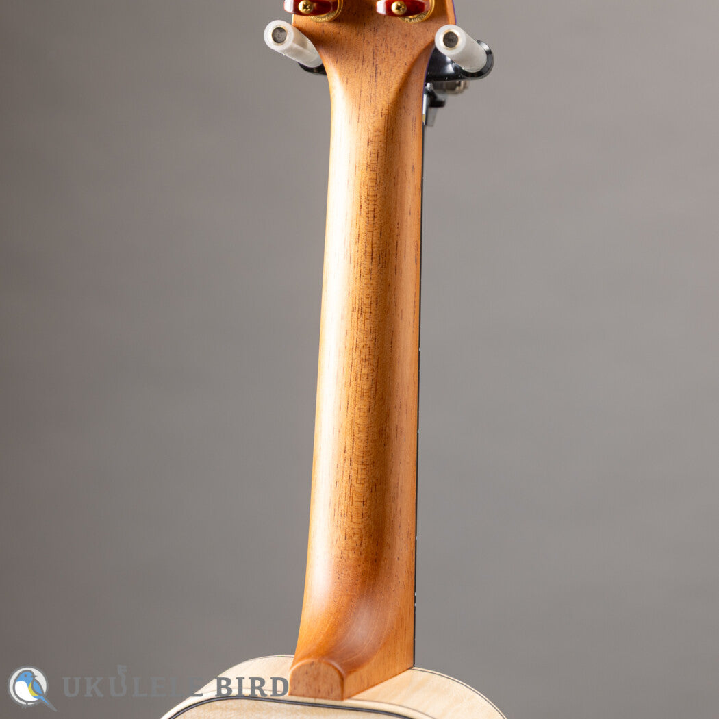 宝石のアメジストをイメージして作られたイングルマンスプルース x ヨーロピアンメイプルのウクレレバード5周年記念モデルコンサートウクレレ!ポジションマークには天然石のアメジストが入れられています