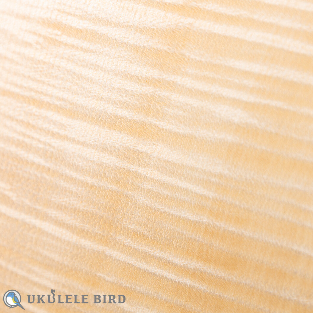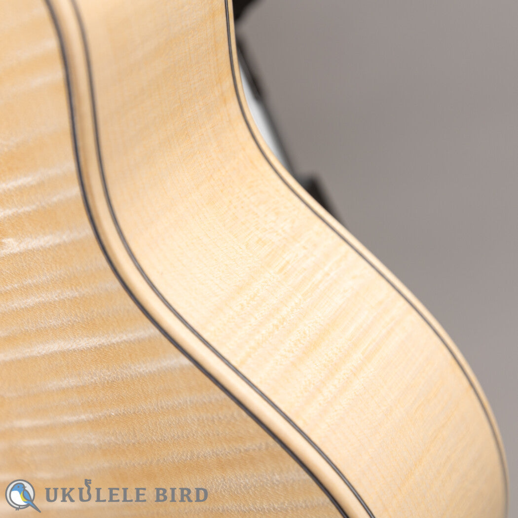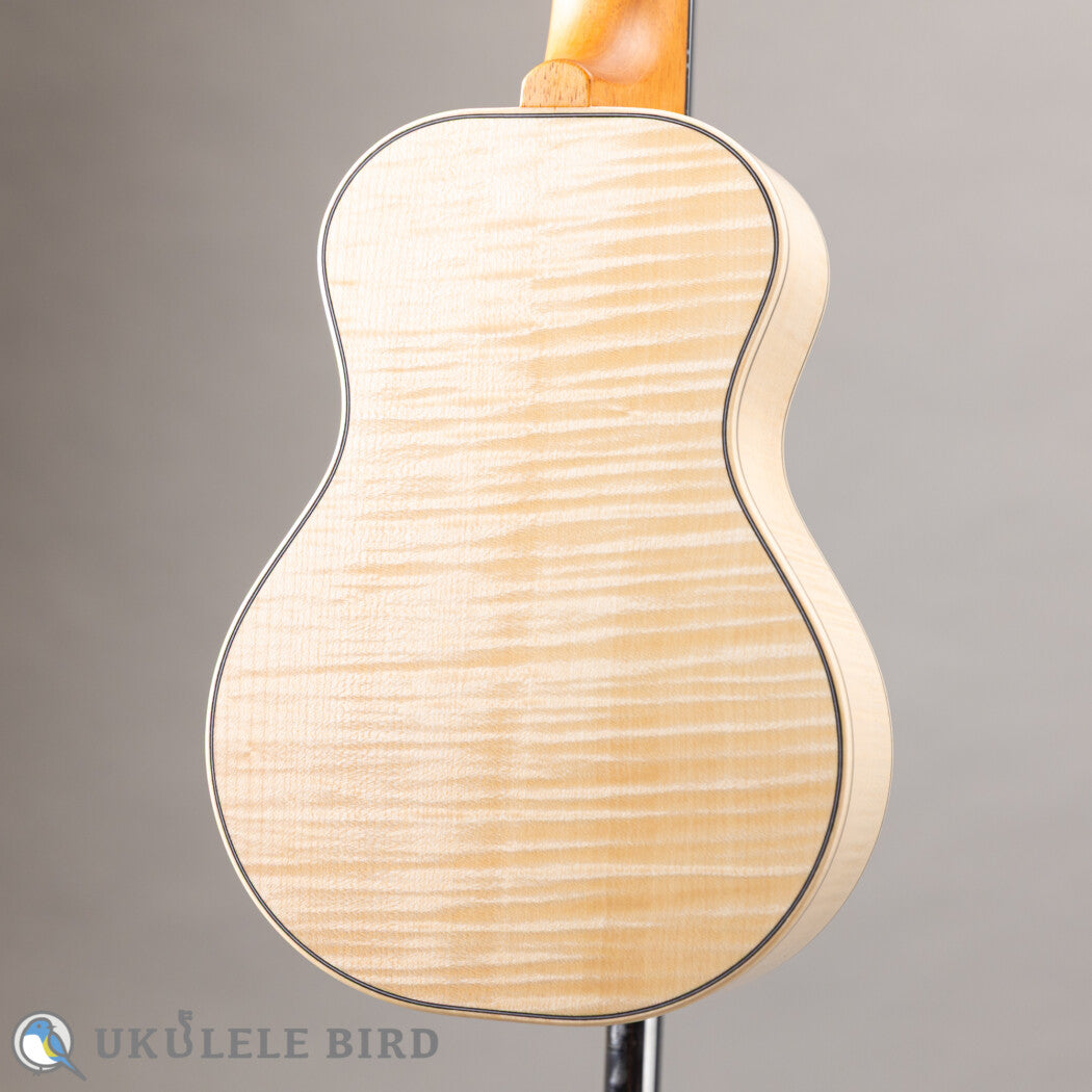 トップはイングルマンスプルース、サイドバックには目の詰まった美しいヨーロピアンカーリーメイプルが使われています。サイドのメイプルは2枚を張り合わせたダブル構造になっており、サイドをしっかりと固め、トップ板の振動の鳴りを増長する設計になっています。