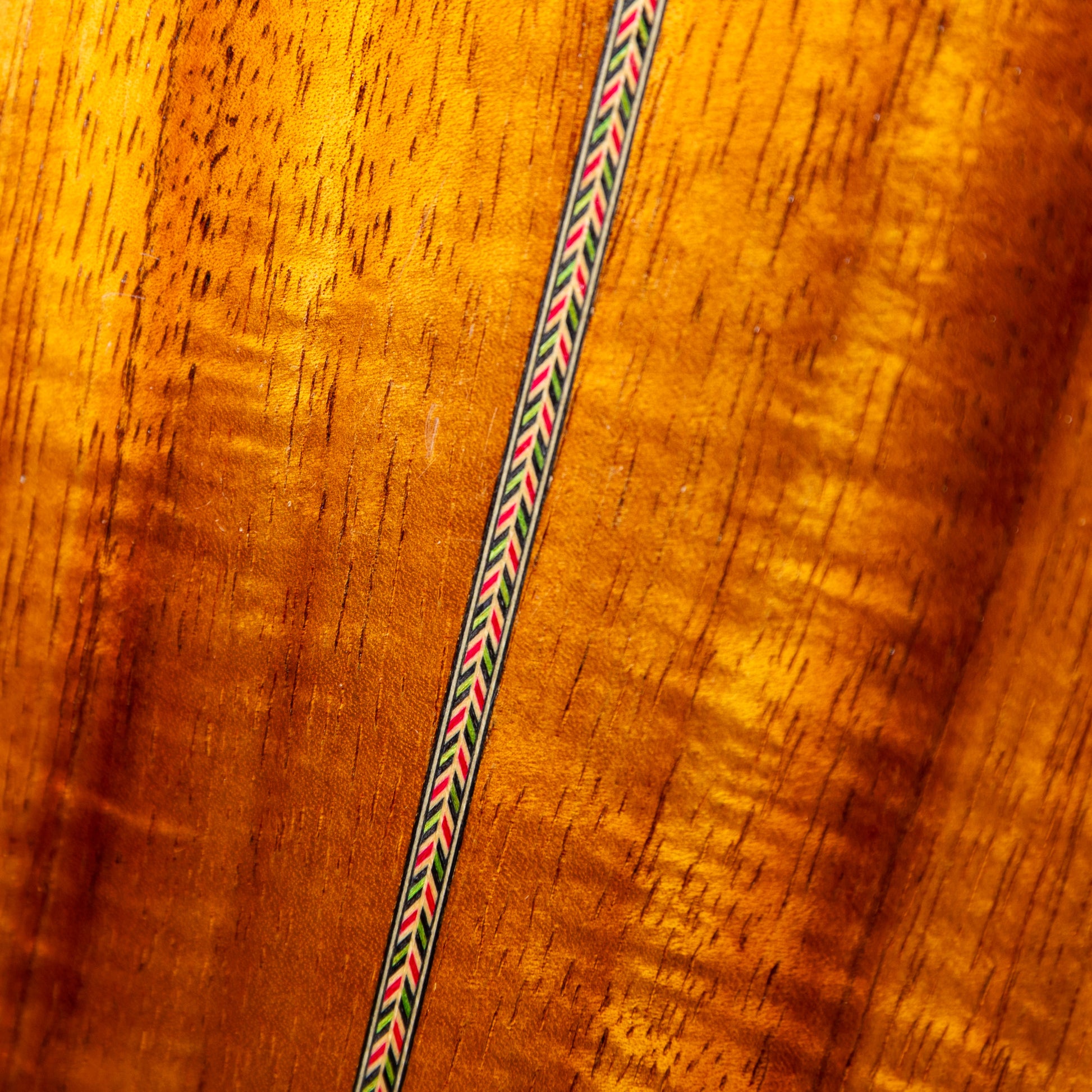 本楽器はトラディショナルなベルシェイプのソプラノウクレレで、カーリーの入ったグレードの高いハワイアンコアが使われています。トップのパーフリング、ロゼッタ、指板を囲む形でアバロンバールが巻かれており、ゴージジャスなルックスです。