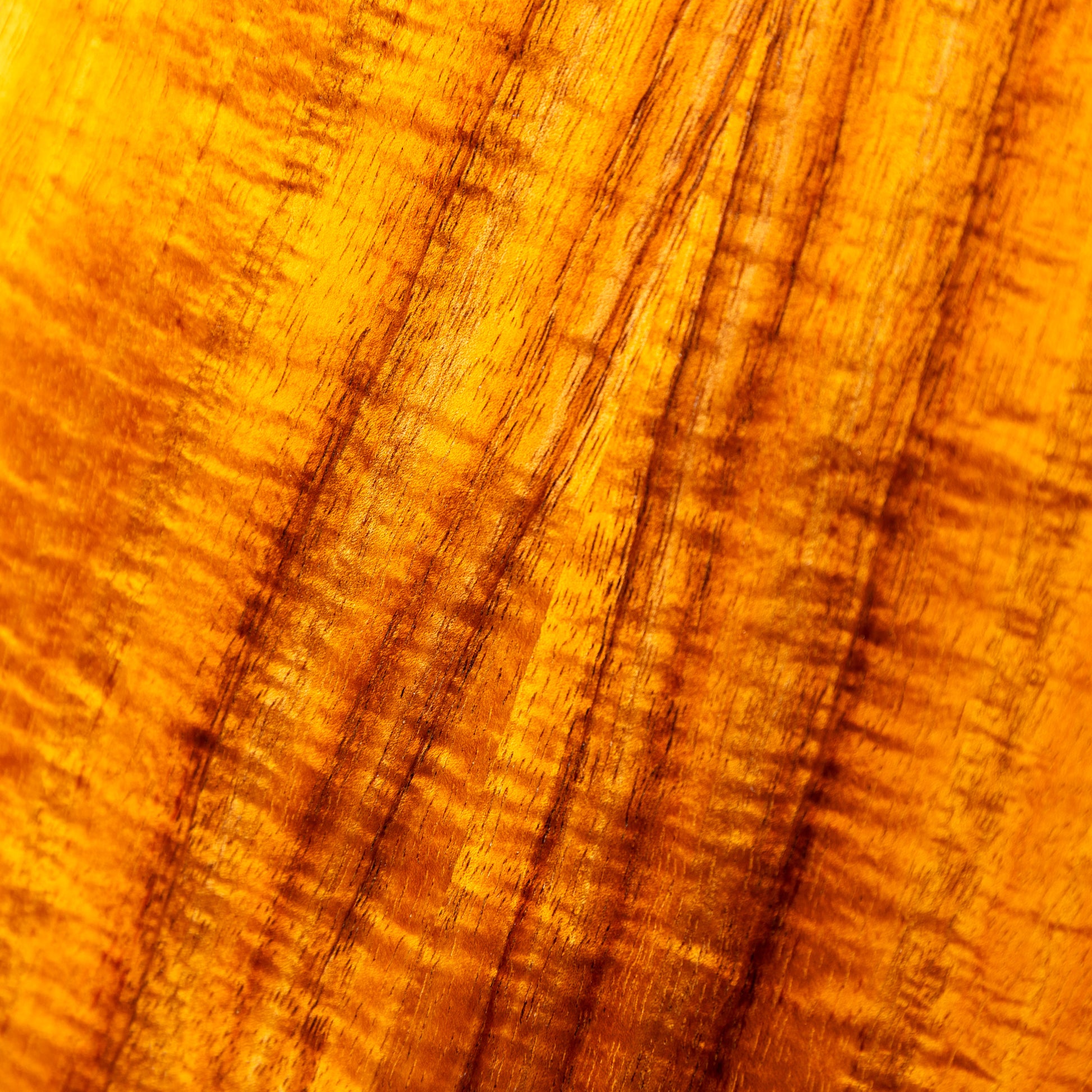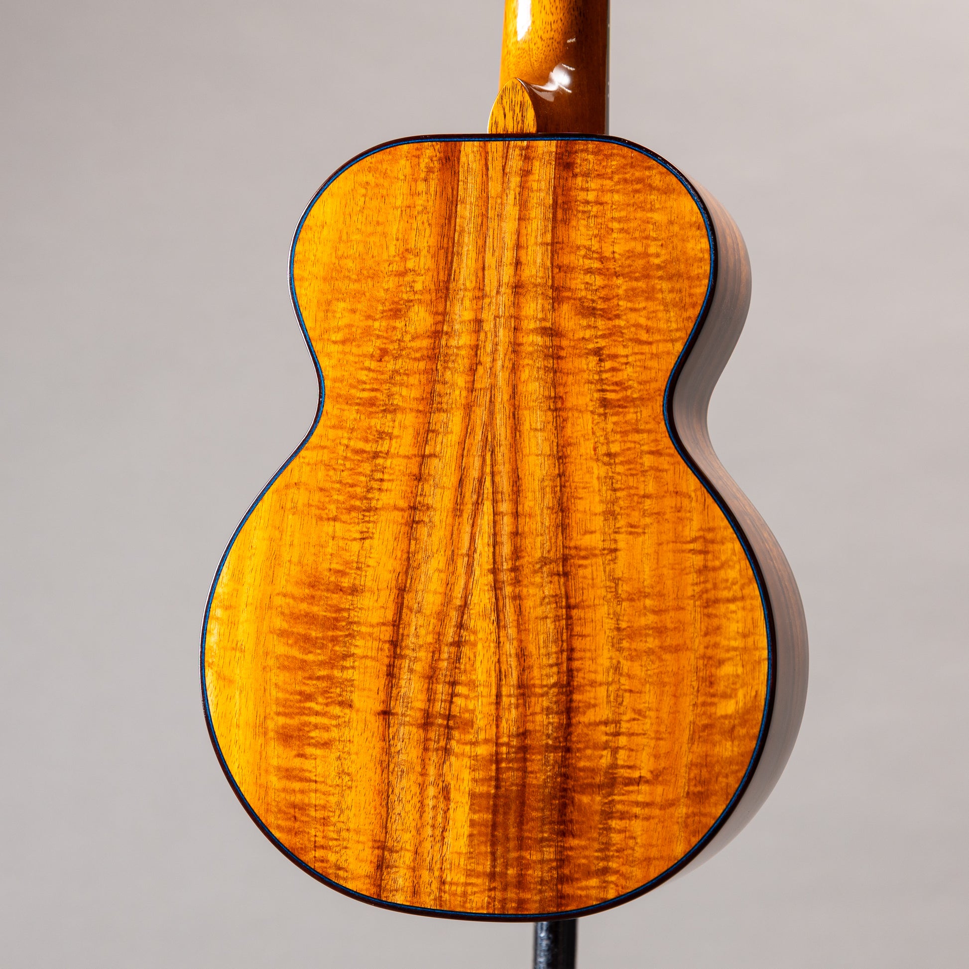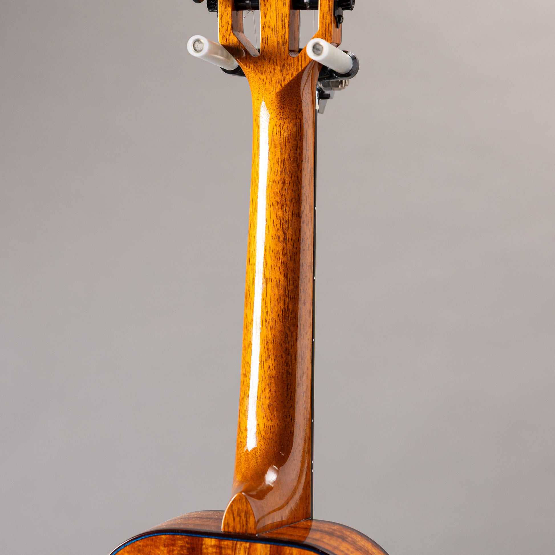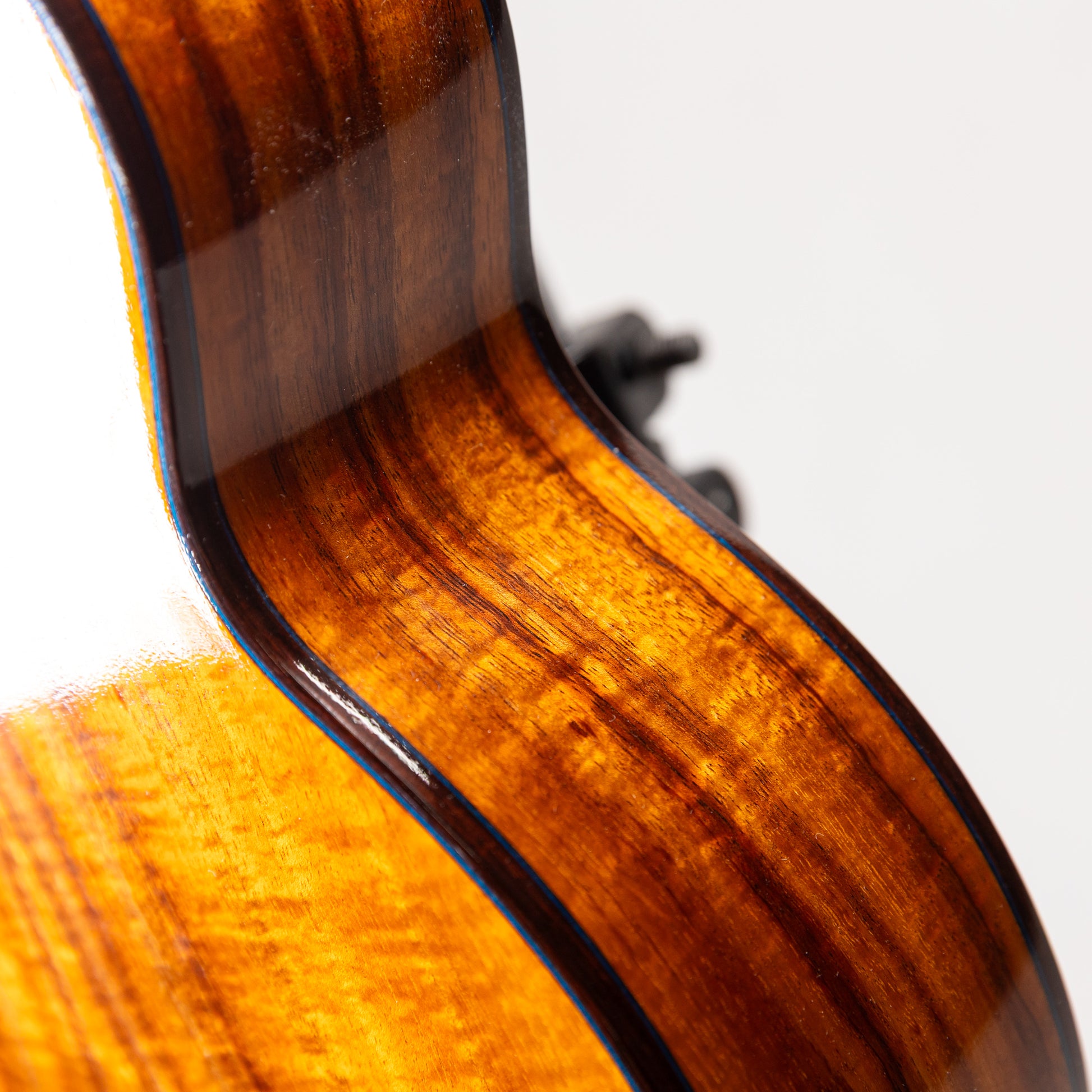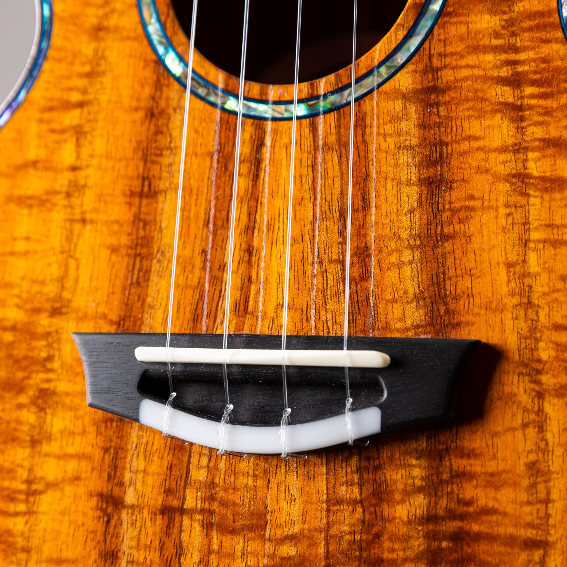 白蝶貝のパーフリングがブルー染木で縁取られており、ジェイク・シマブクロ氏が愛用する“ブルー”と称されるカマカウクレレから着想を得たデザインです。ブリッジの弦巻き部には人工大理石が埋め込まれています。